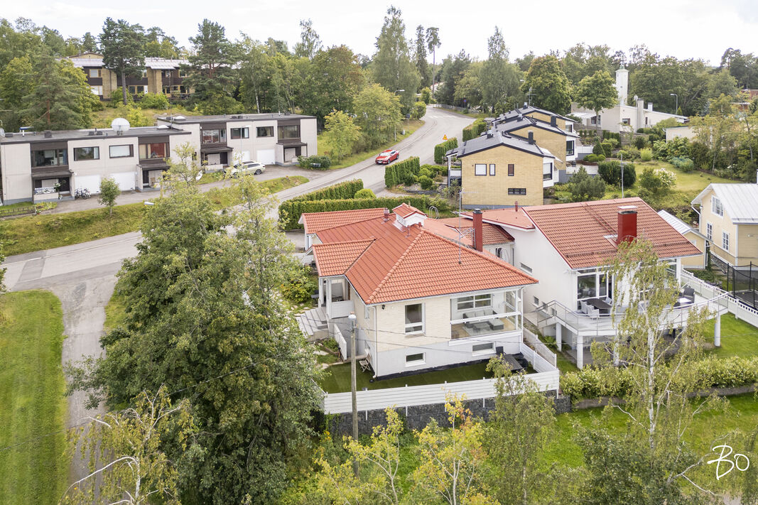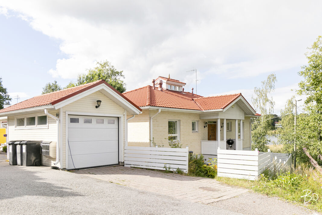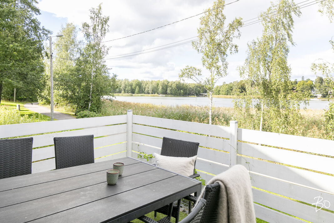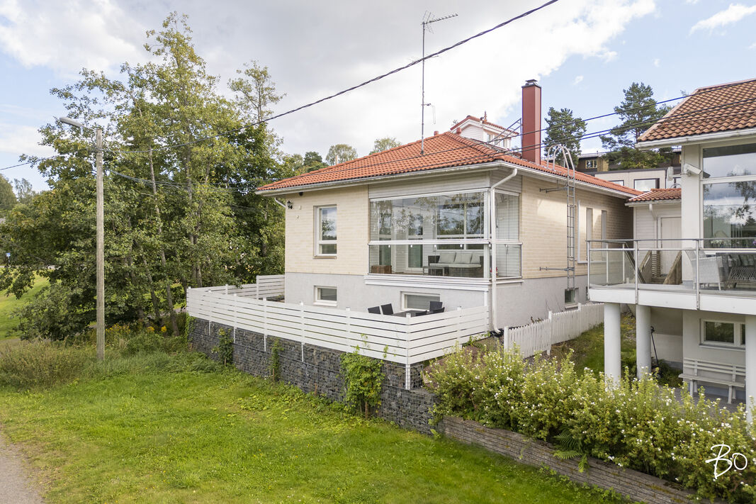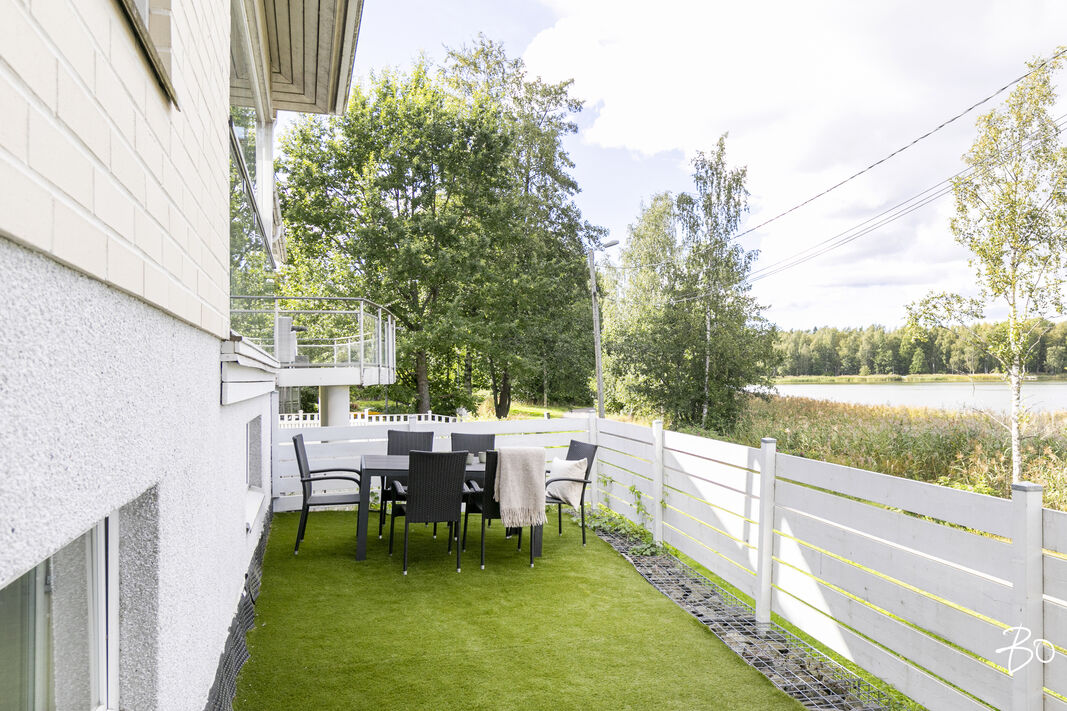 Talossa on lasitetty terassi, josta on kiva saaristolaisnäkymä ja aidatulla piha-alueella on viihtyisä oleskelualue.. Piha-alue on suunniteltu viihtyisäksi ja esimerkiksi lasten leikkialueeksi turvallisuutta unohtamatta.
