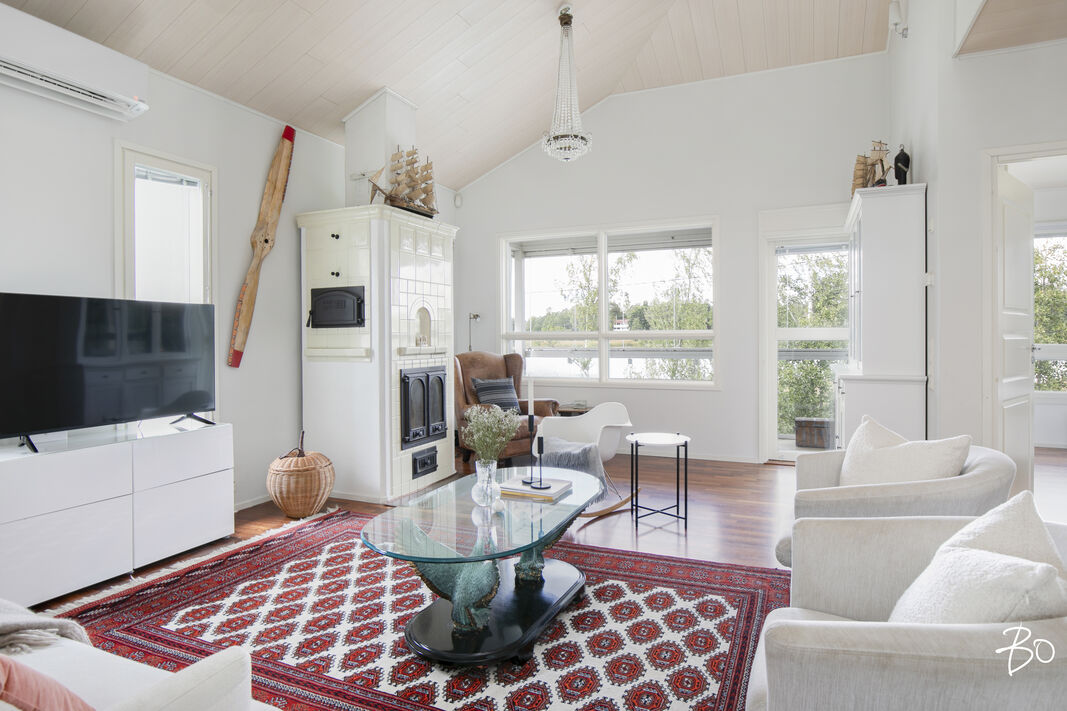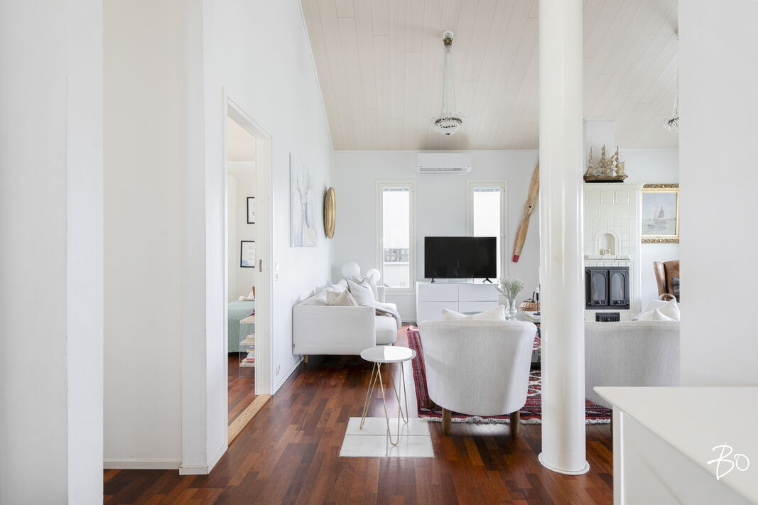 Tämän kodin sisätilat hurmaavat vaaleilla sisustussävyillään ja tilavalla, korkealla olohuoneellaan, joka kylpee luonnonvalossa. Olohuoneen ikkunoista avautuu kaunis ja avoin merinäköala.