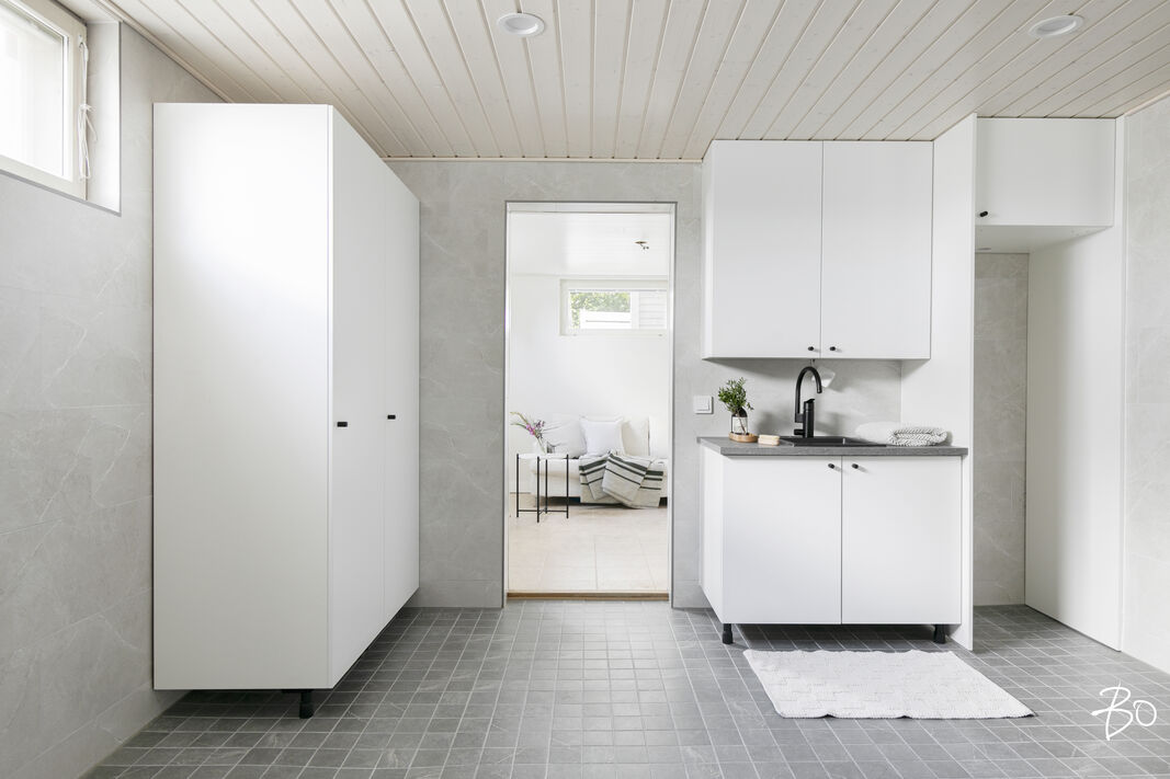 Varustus: pesuallas, lattialämmitys, lattiakaivo, pyykkikaapit, pöytätaso