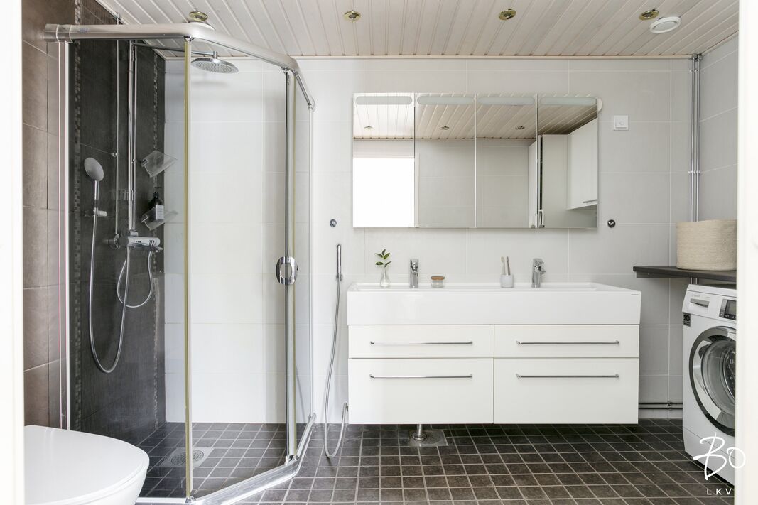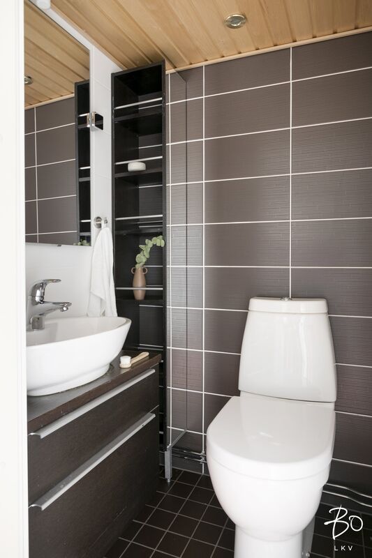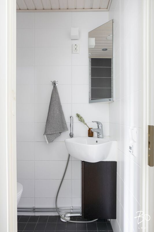 Alakerran wc: Swedbergin peili, malja-allas+kaappi ja avohyllykkö. Seinät ja lattia laatoitettu. Lattialämmitys sähköllä. Molemmat wc:t saneerattu putkiremontin yhteydessä yhtiön toimesta 2014.