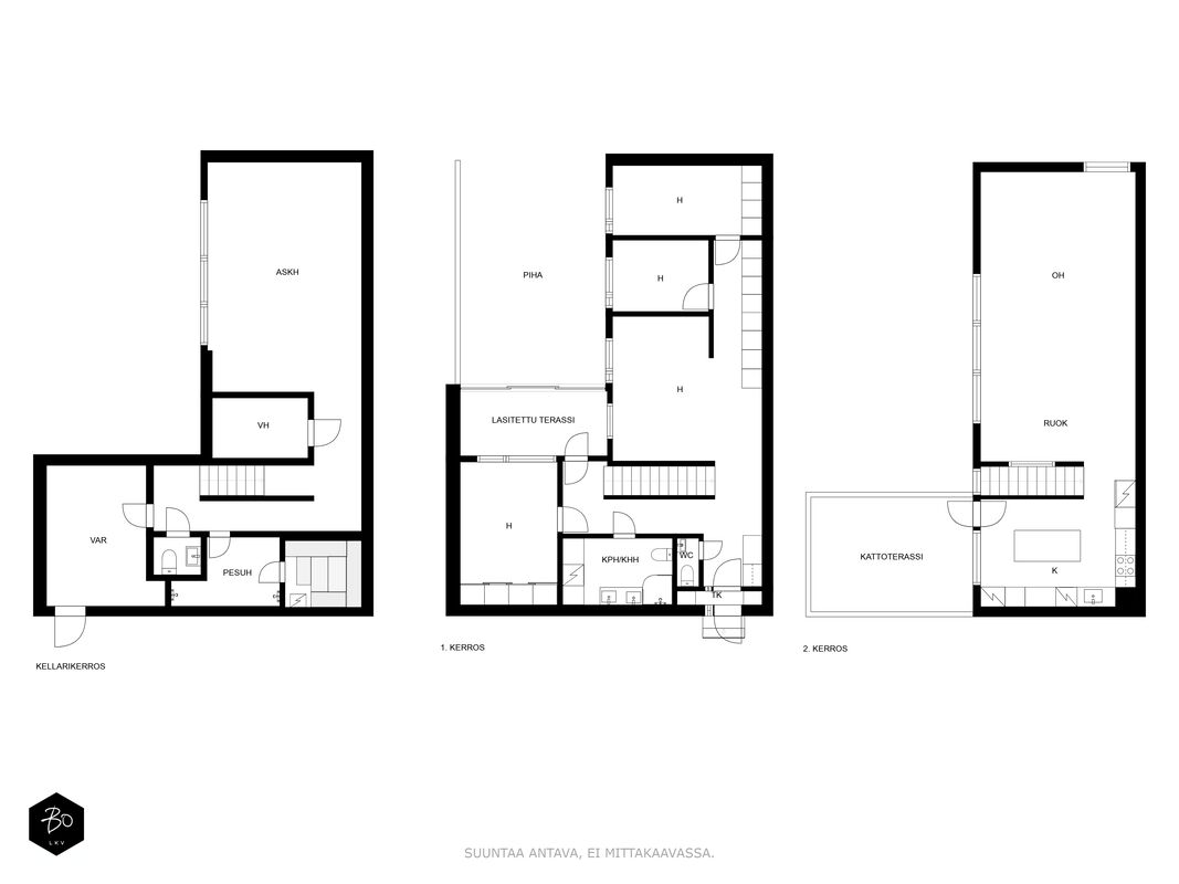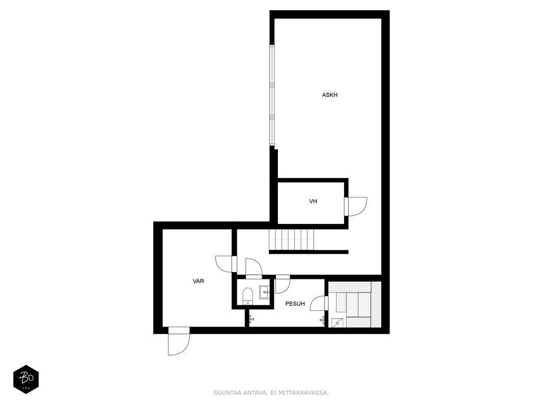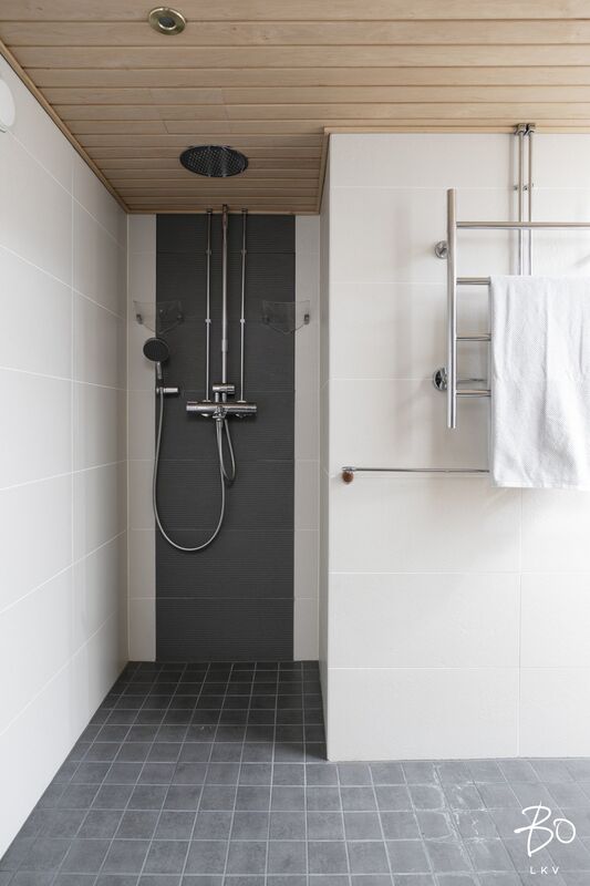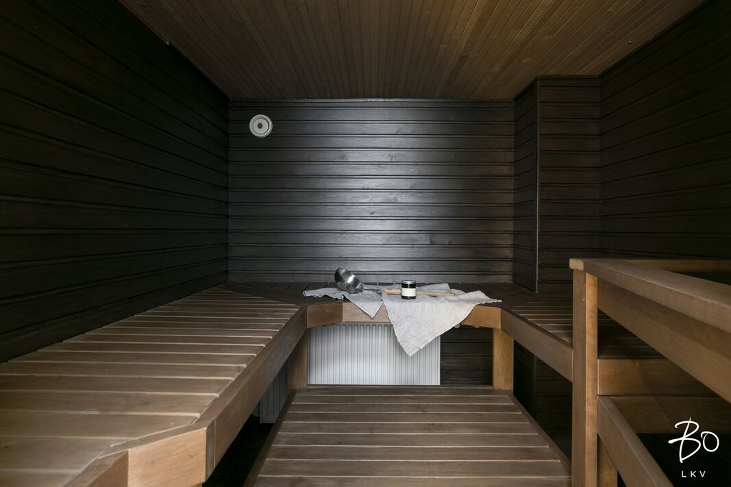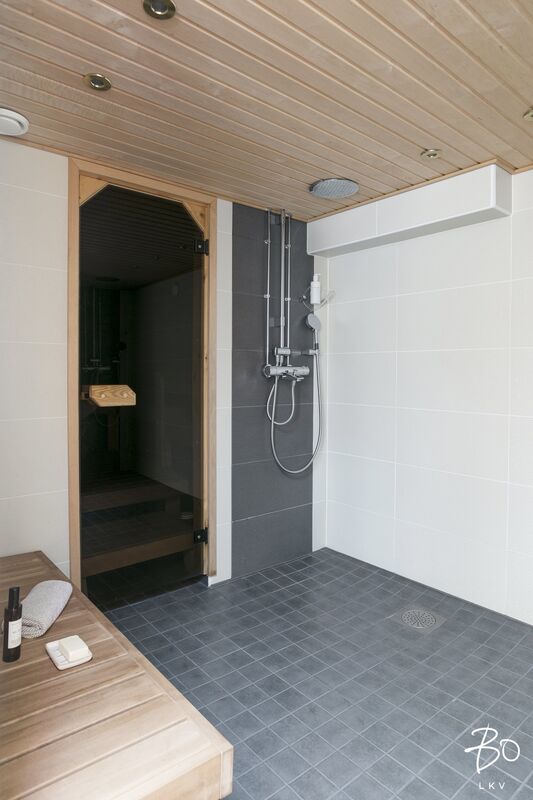 Pohjakerroksessa on hyvät tilat monenlaiseen käyttöön. Loistotilaisuus esimerkiksi yrittäjälle, (voi vaikka vuokrata tilat omalle yritykselle ja saada siitä itselle vuokratuloa) sillä pohjakerrokseen on oma sisäänkäyntikin. Nykyisellään siellä oleva suuri huone toimii mainiosti työ- ja viihdetilana. Lisäksi pohjakerroksessa on hieno saunaosasto, jonka tilavassa saunassa on mm. kuituvalot ja vuolukivikiuas sekä pesuhuoneessa tyylikkäästi kattoon upotetut sadesuihkut. Asunnon kaikki pesutilat on saneerattu upeasti yhtiön putkiremontin yhteydessä vuonna 2014. Pohjakerroksessa on vielä vaatehuone ja hyvänkokoinen varasto, jonne pääsee siis suoraan ulkokautta.