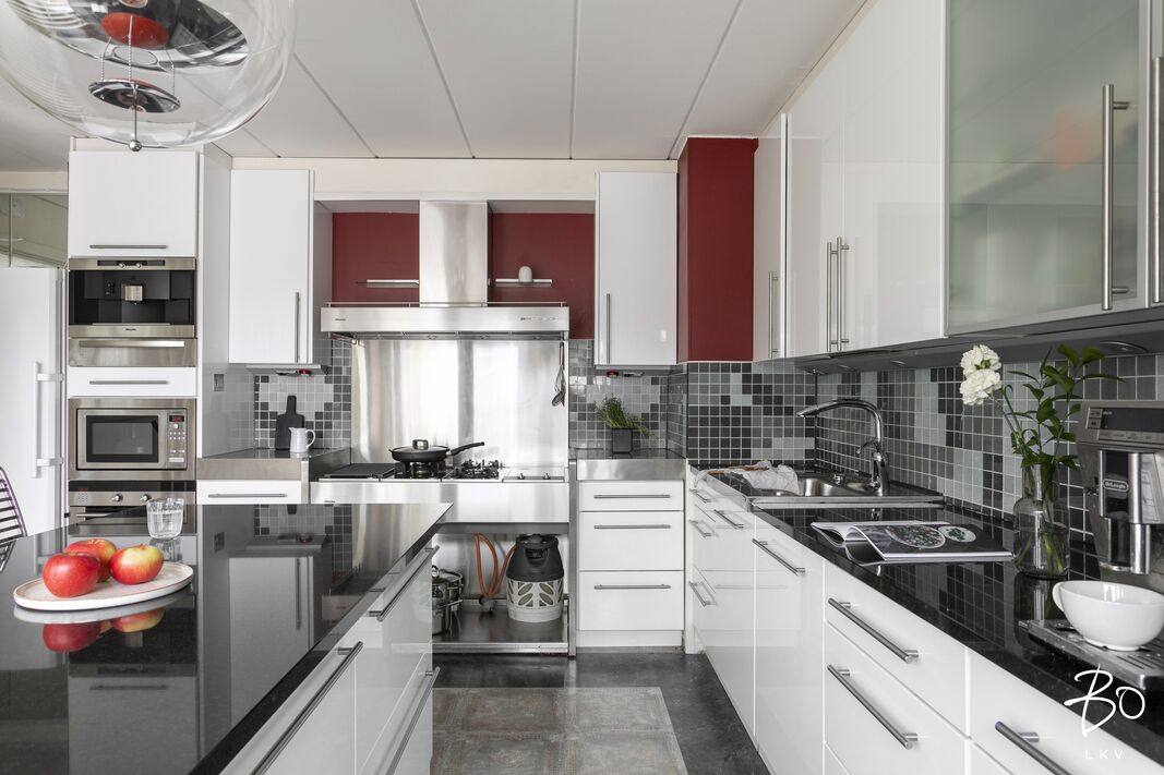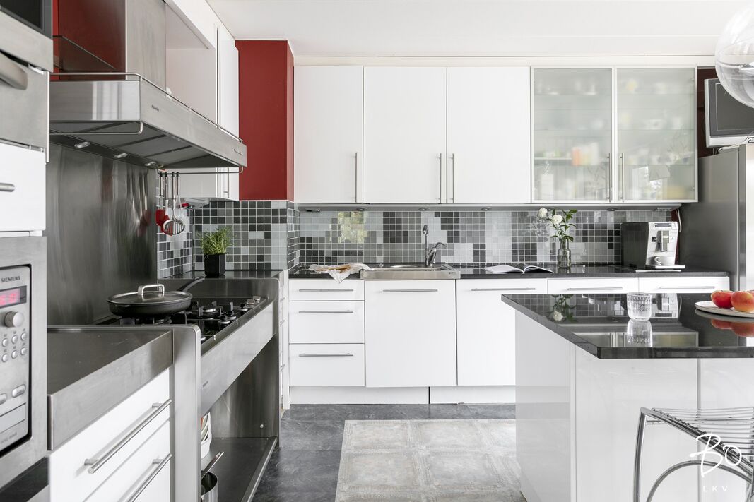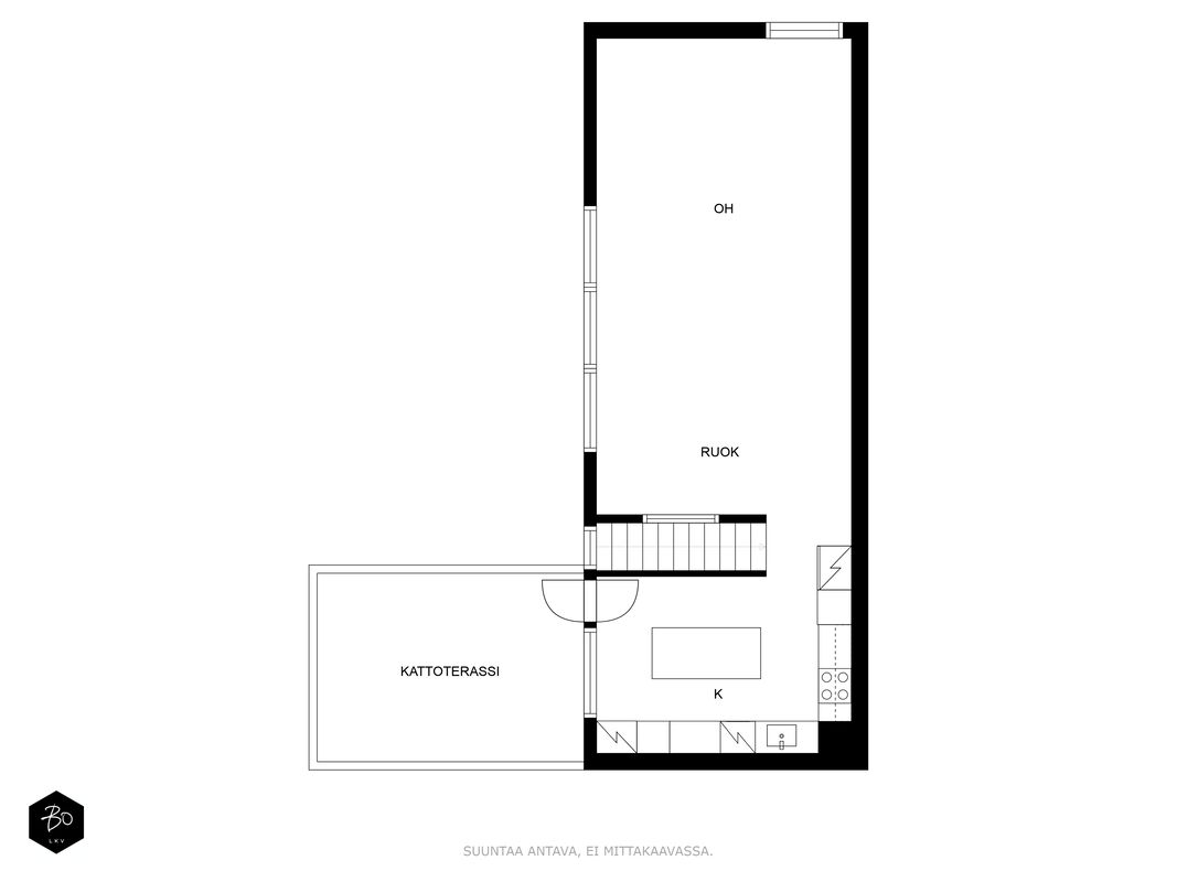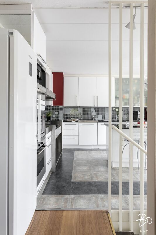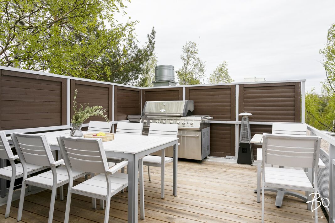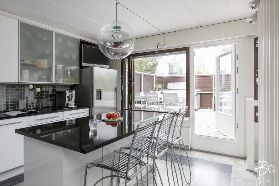 Yläkerrassa on suuri olohuone, jossa on ikkunoita kahteen suuntaan sekä harvinaisen monipuolinen ja upea keittiö, jossa kotikokki ei jää varmasti mitään kaipaamaan. Sieltä löytyy muhkea Miele Cooktop kokonaisuus, jossa on 2 kaasupoltinta + wokkipannupoltin + 2 induktiokeittotasoa + laavakivigrilli + liesituuletin koko leveydeltä. Keittiössä on myös esim. kivitasoon upotettu yleiskone, jääkaappipakastin, jossa on juomavesiautomaatti ja jääpala-automatiikka sekä vielä integroitu kahvikone ja jopa astianlämmitin. Lisäksi on vielä kivitasollinen saareke, jossa on vetolaatikot. Keittiöstä on käynti aurinkoiselle saneeratulle kattoterassille, joka toimii mainiona keittiön jatkeena, jossa on tilaa istua iltaa ja grillailla isommallakin porukalla. Kattoterassilla voit myös ihailla vehreää maisemaa, nauttia auringosta ja kuunnella lintujen laulua.