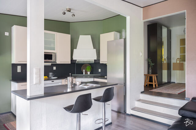 Jolloin myös keittiön ja olohuoneen välinen seinä on purettu pois.