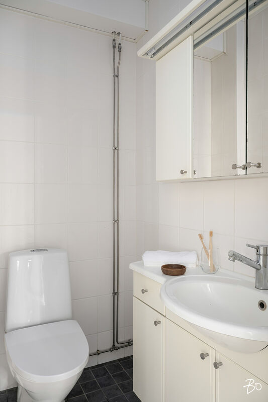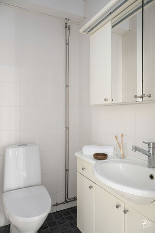 Varustus: wc-istuin, allas/allaskaappi, peilikaappi, laatoitettu, lattialämmitys.