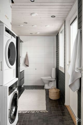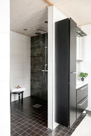 Varustus: sadesuihku, allas/allaskaappi, peili, wc-istuin, pesukoneliitäntä, tilaa pesutornille, laatoitettu, lattialämmitys (sähkö).