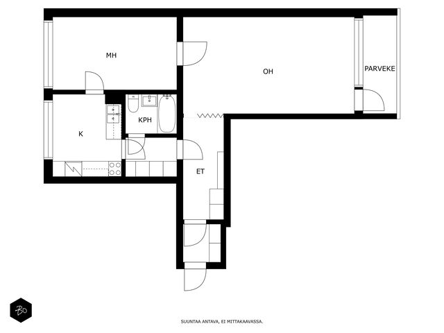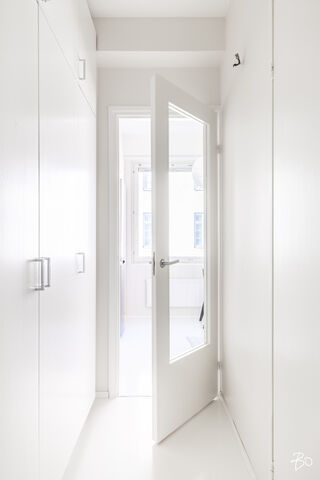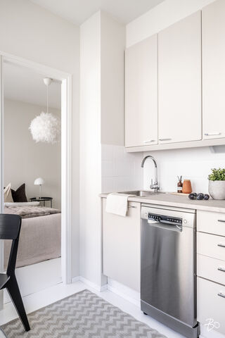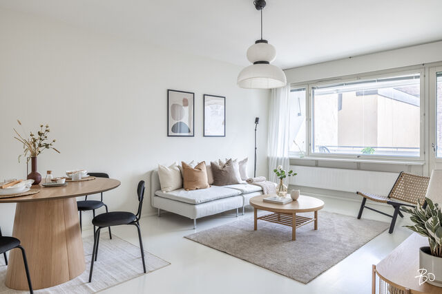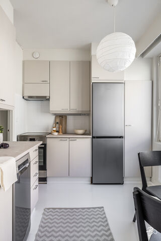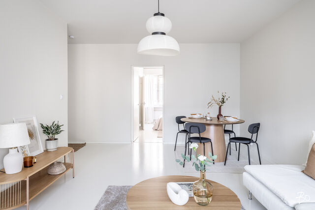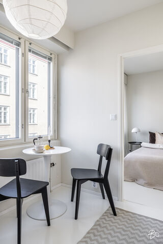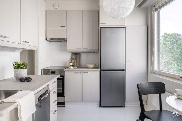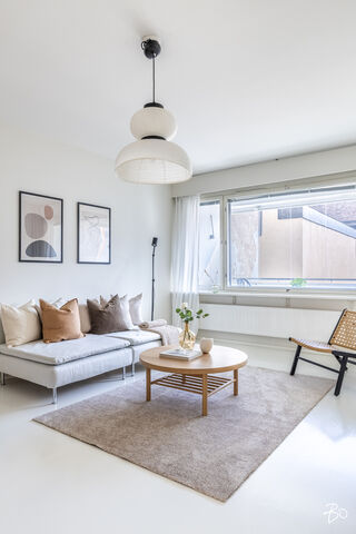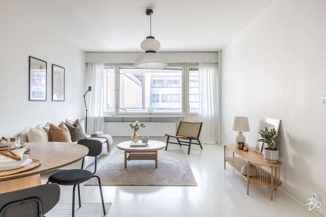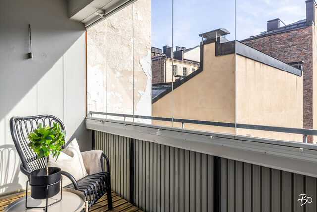 Eerikinkadun sydämessä sijaitseva kaksio hurmaa heti ensisilmäyksellä modernilla ja huolella viimeistellyllä ilmeellään. Keittiö on kuin sisustuslehden sivuilta - on tehty useita parannuksia ja varustettu laadukkailla kodinkoneilla, uusilla työtasoilla ja tyylikäs design-hana viimeistelee kokonaisuuden. Olohuone jatkaa samaa raikasta linjaa suurine ikkunoineen, jotka päästävät valon virtaamaan tilaan. Lasitettu parveke avautuu rauhalliselle sisäpihalle, tarjoten ihanteellisen paikan aamukahville tai iltahetkille. Myös kylpyhuone hurmaa - vuonna 2018 uusittu tila yhdistää lattialämmityksen mukavuuden ja modernit materiaalit, ja sinne mahtuu myös pesutorni kätevästi.