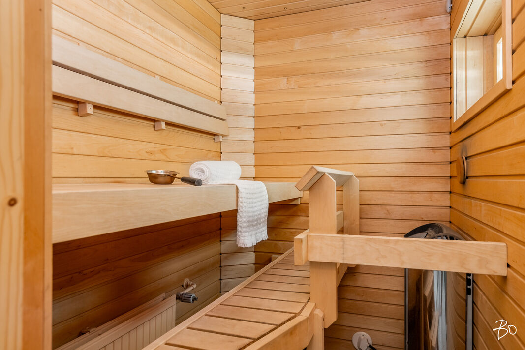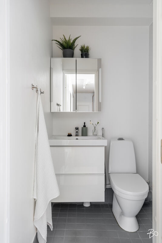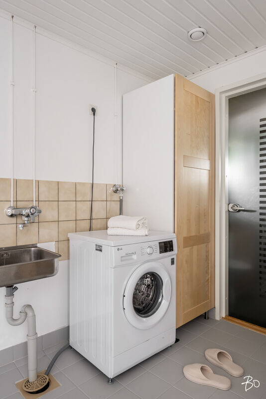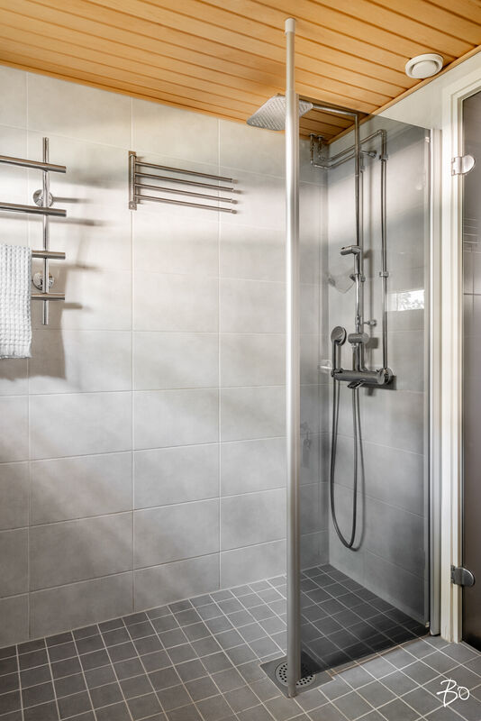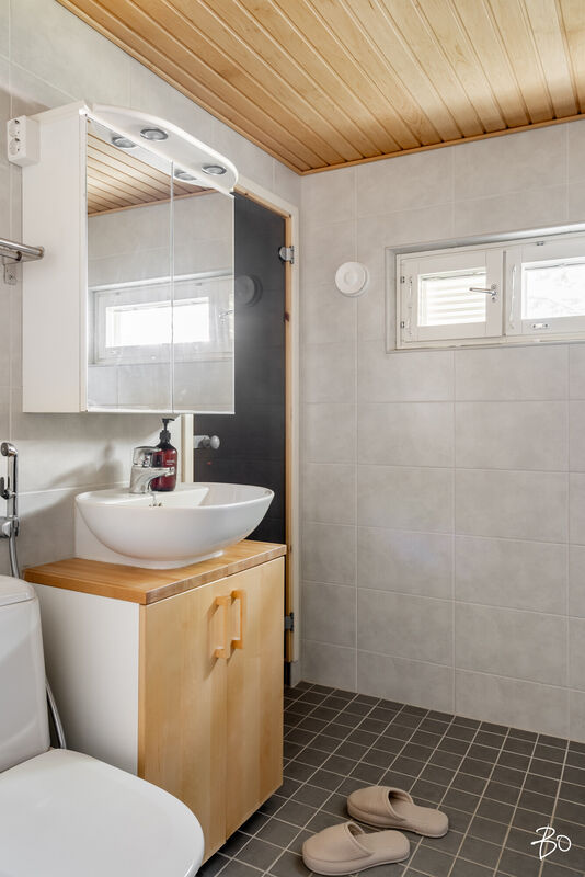 Varustus: suihku, käsisuihku, suihkuseinä, allas/allaskaappi, peilikaappi, wc-istuin, bideesuihku, kaappi, pyyhekuivain, laatoitettu, lattialämmitys, käynti saunaan.