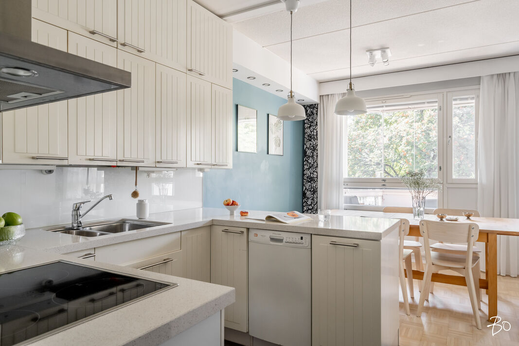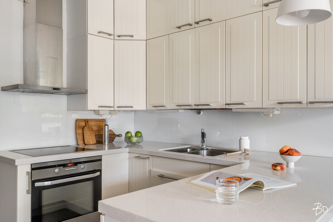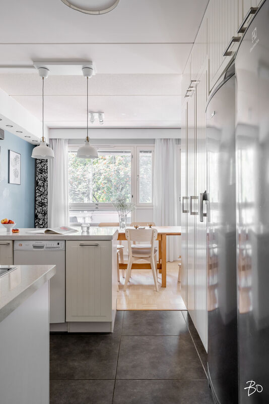 Varustus: induktioliesi, kalusteuuni, liesituuletin, täyskorkeat jääkaappi ja pakastin, astianpesukone (45 cm).
