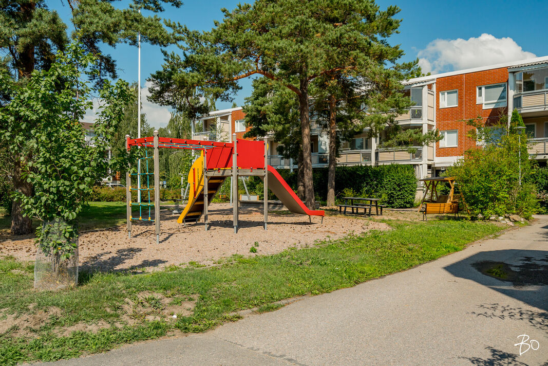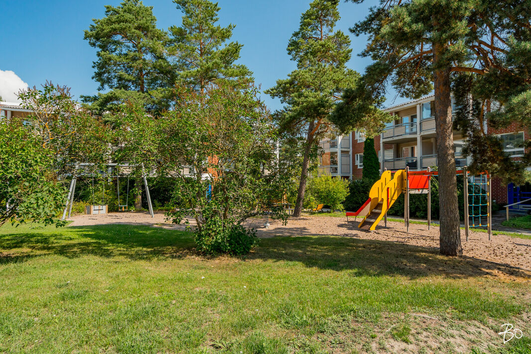 Taloyhtiö on hyvin hoidettu ja sen asukkaat voivat nauttia kauniista ja viheralueiden ympäröimästä piha-alueesta. Viihtyisä leikkipaikka on lasten suosikki. Talossa on yhteensä kolme kerrosta ja tämä asunto sijaitsee kätevästi ensimmäisessä kerroksessa, mikä tekee liikkumisesta erityisen vaivatonta. Taloyhtiöllä on tilavat varastotilat sekä muut arkea helpottavat yhteiset tilat.