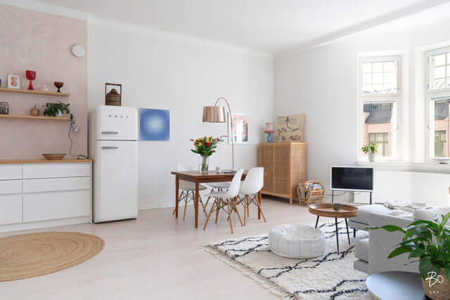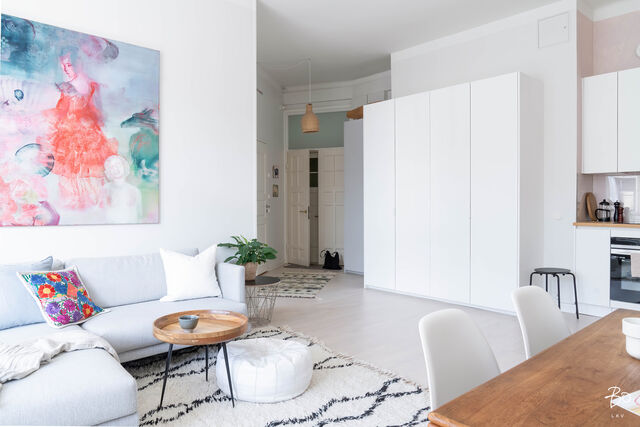 Tämä huoneisto ihastuttaa heti sisään astuessa korkealla olohuoneellaan, joka viehättää avaruudellaan ja valovoimaisuudellaan. Kaunis avokeittiö avautuu olohuoneeseen, tarjoten mahdollisuuden niin rentoon arkeen kuin elegantteihin illanviettoihin. Asunnon sisustusratkaisut ja huoliteltu viimeistely huokuvat laatua ja tyylikkyyttä, joissa jokainen yksityiskohta on tarkoin harkittu. Ajattomuus ja harmonisuus takaavat esteettisesti miellyttävän ympäristön.