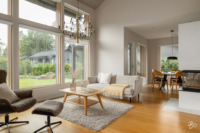 Talossa on suuri ja avara olohuone, jossa huonekorkeus on korkeimmillaan 5,7 m. Olohuone yhdistyy ruokailutilan kautta näyttävään mustaan keittiöön, jossa on Topi-Keittiön laadukkaat mustat keittiökalusteet. Kalusteisiin pehmeyttä tuovat tammen sävyiset kehykset ja messinkiset vetonupit kaapistojen ovissa. Tyylikkyyttä täydentävät mustat Dekton-kivitasot, Festivon musta kotikylmiö, Mielen induktioliesi- ja musta erillisuuni sekä Savon musta liesituuletin. Mielen mikroaaltouuni ja Askon astianpesukone ovat integroitu mustiin kalusteisiin. Isot 60 x 60 marmorikuvioidut vaaleat lattialaatat sopivat täydellisesti keittiöön. Olohuoneen ja ruokailutilan lattioissa on laadukkaat tammilankkuparketit ja seinät on maalattu mulperin sävyllä, jotka yhdessä luovat kotiin pehmeän ja tyylikkään tunnelman. Ruokailutilasta on käynti lasitetulle terassille ja takapihalle.