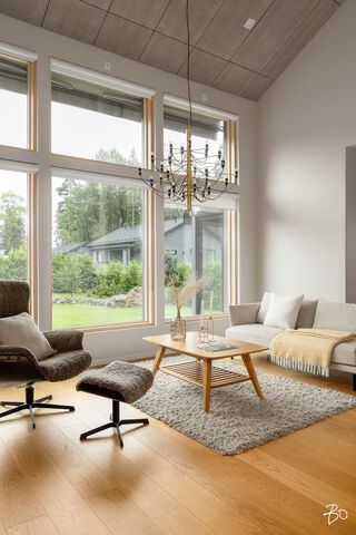 Olohuoneen huonekorkeus on korkeimmillaan 5,7 metriä.
