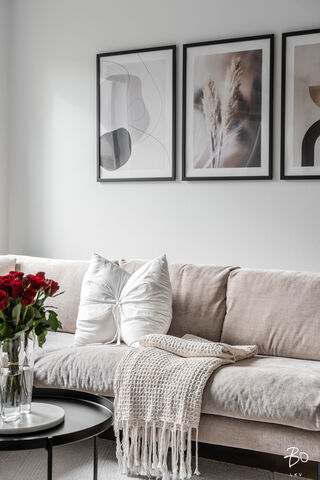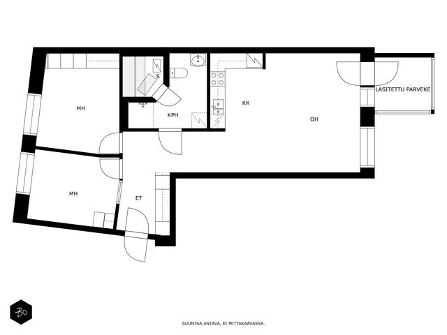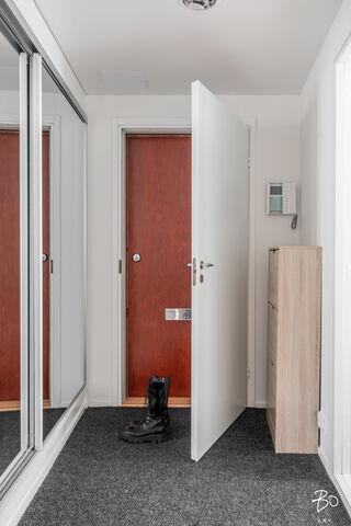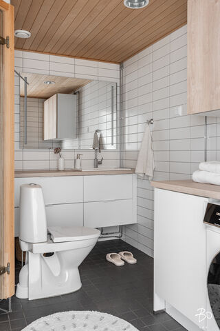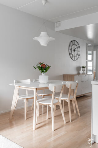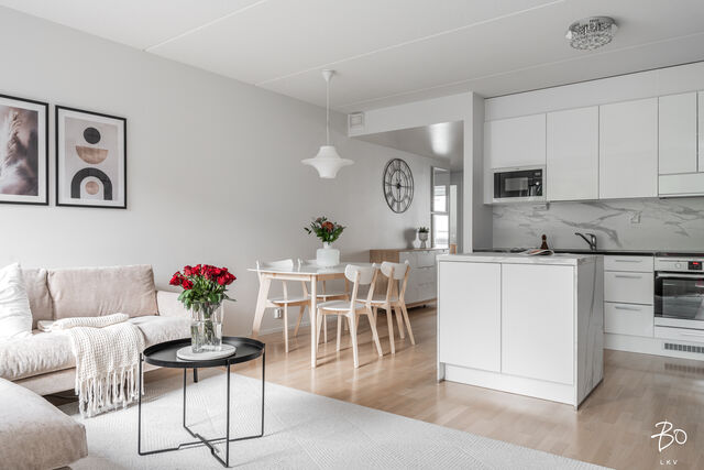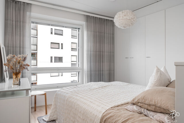Pohjaratkaisu on toimiva: kaksi makuuhuonetta sijoittuvat fiksusti erilleen olohuoneesta ja käytännölliset säilytysratkaisut helpottavat arkea. Parkettilattiat ja neutraalit pintamateriaalit antavat kodille selkeän ja ajattoman ilmeen, jota on helppo täydentää omalla sisustustyylillä.