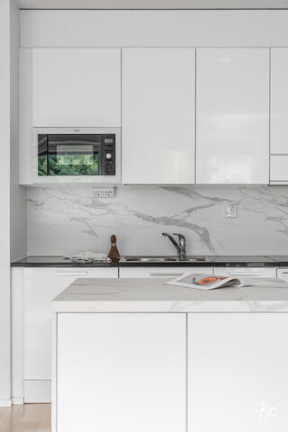 keraaminen liesitaso, astianpesukone, mikroaaltouuni. Kivitasot, saarekkeessa laminaattitaso.