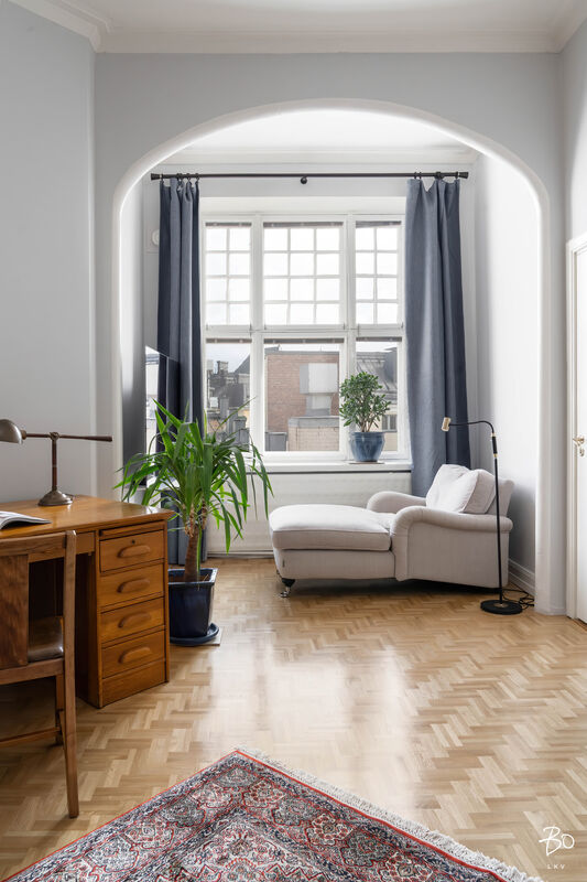 Toinen makuuhuone: Kauniit kaarikoristeet, alkovi. Valoisat ja avarat näkymät talon sisäpihalle. Helsingön valaistu Ensiö-kaappi.