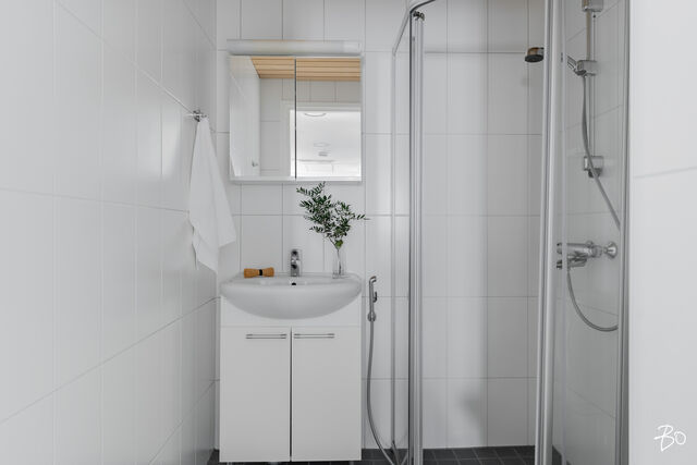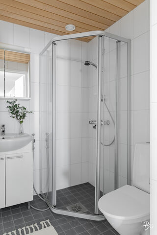 Toisessa kylpyhuoneessa suihku, wc-istuin sekä käsienpesuallas kaapistoineen.