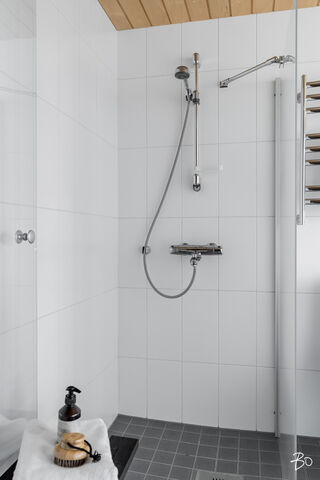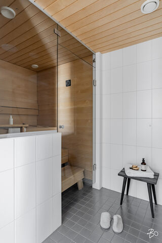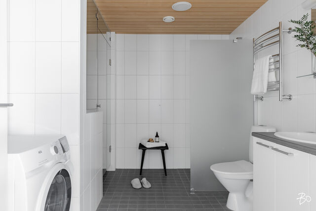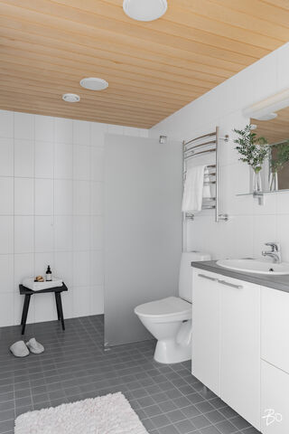 Arkea helpottaa kaksi kylpyhuonetta, joissa molemmissa on wc:t. Molemmat kylpyhuoneet ovat toteutettu todella ajattomin materiaalivalinnoin. Saunallisessa kylpyhuoneessa on lisäksi tilat pyykkihuollolle.