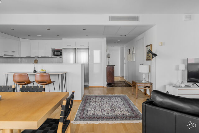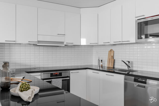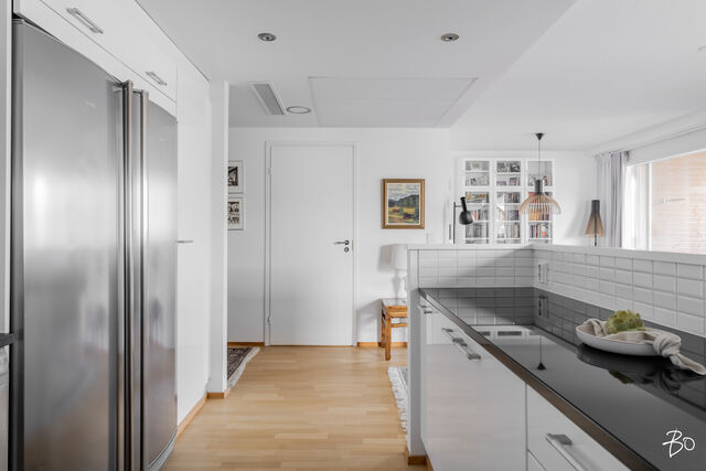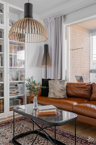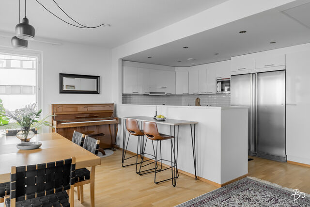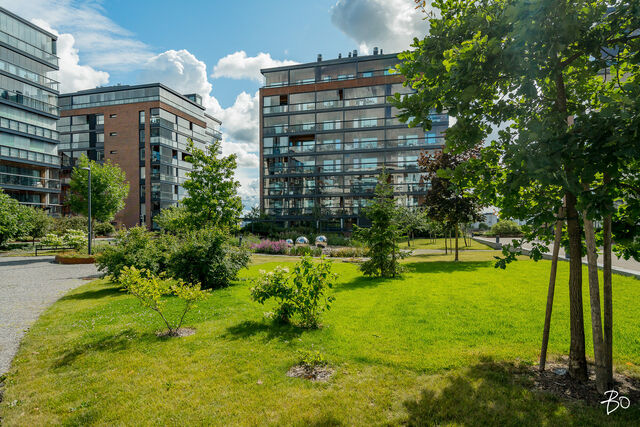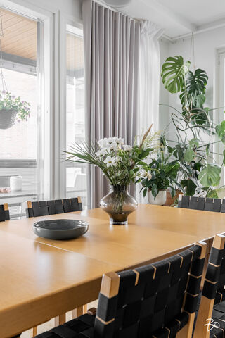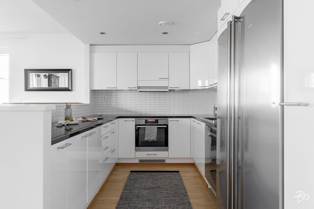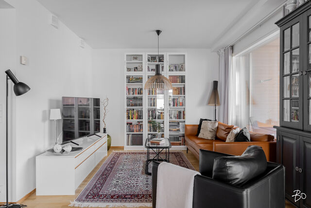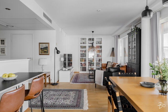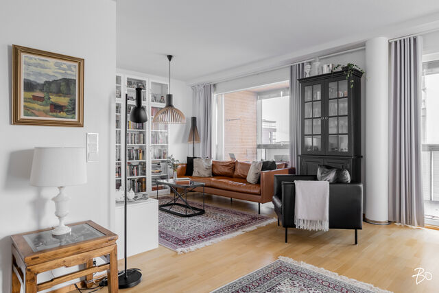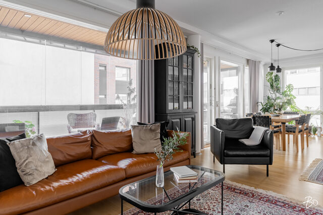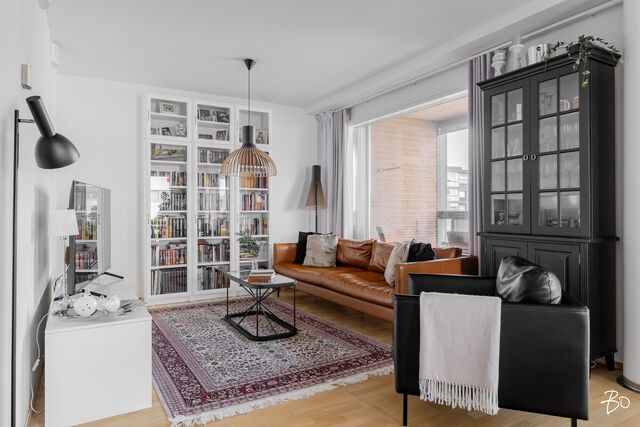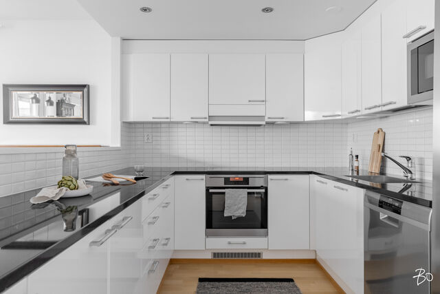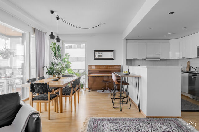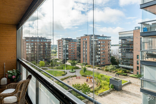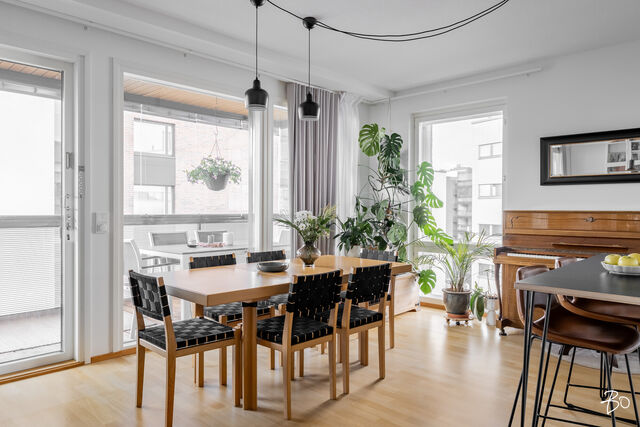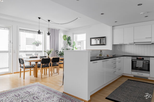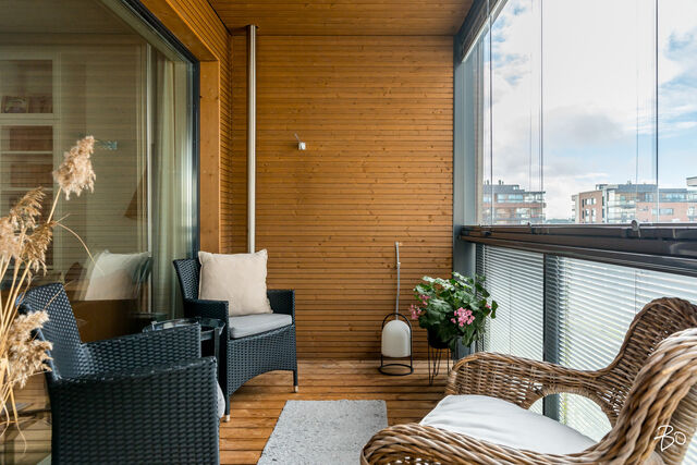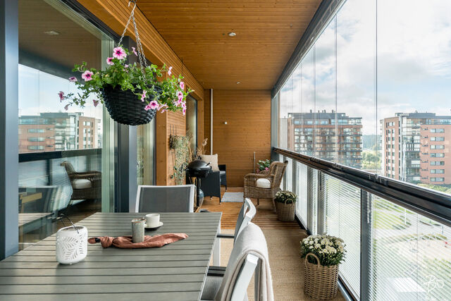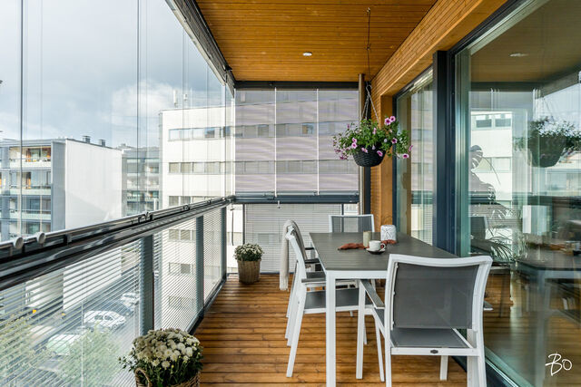 Kodin kivitasoilla varustettu niemekkeellinen avokeittiö on ajaton ja sen vierellä on paikka isolle ruokailuryhmälle. Olohuoneesta on käynti koko asunnon levyiselle lasitetulle parvekkeelle, joka toimii kuin lisähuoneena lämpiminä vuodenaikoina. Parvekkeen näkymät sijoittuvat sisäpihan ja Lenkkipolun suuntaan lounaaseen, joten täällä pääset nauttimaan auringonsäteistä aamupäivästä aina iltaan asti.