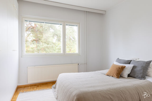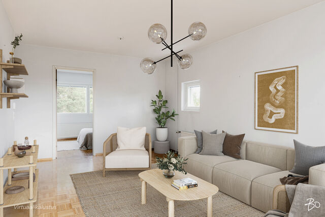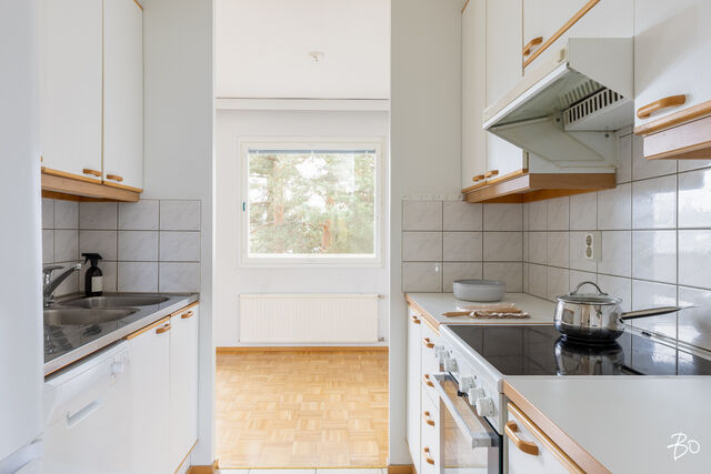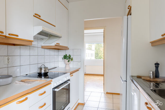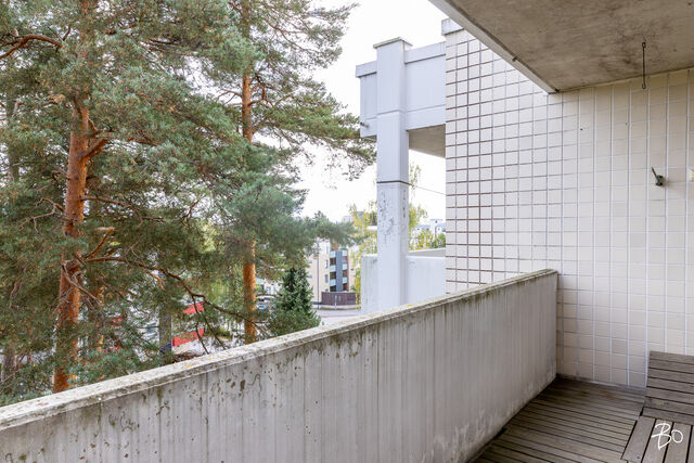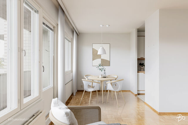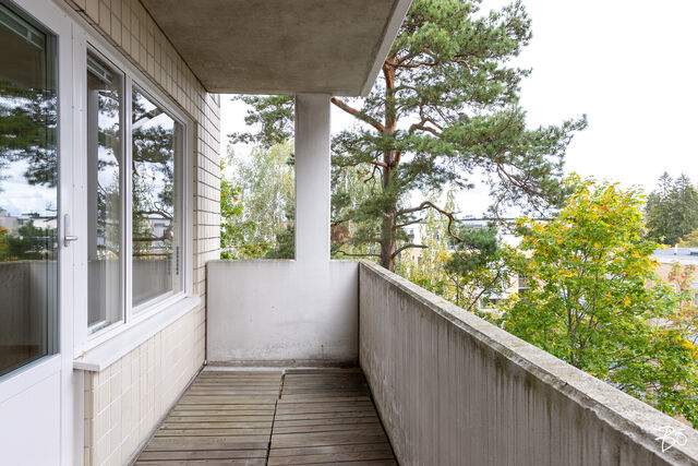 Tämän kodin sydän on suuri, valoisa olohuone, joka yhdistyy saumattomasti ruokailutilan kautta keittiöön. Trendikäs mosaiikkiparketti ja vaaleat pintamateriaalit antavat tilaa omille sisustusvalinnoille ja oleskelutiloja voi jatkaa auringon säteiden lämmittäessä myös lähes koko huoneiston levyiselle parvekkeelle. Vehreät puustot suojaavat näkymää ja tuovat luonnon sävyt osaksi sisustusta.