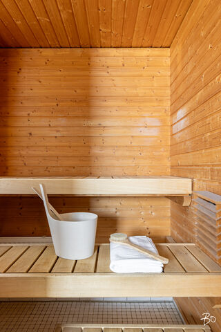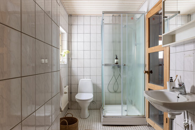 Molemmista makuuhuoneista löytyvät omat säilytyskaapistot ja lisää säilytystilaa on runsain mitoin eteisessä. Vaaleansävyiset pesutilat johdattavat rentoutumaan oman saunan löylyihin.