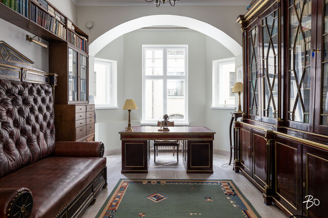 Ei pelkästään kaunis, vaan koti on myös toimiva moderniinkin tarpeeseen. Huoneistoon kuuluu erillinen pieni asunto omalla sisäänkäynnillä ja ovipuhelimella, tälle löytyy varmasti hyvää käyttöä toimistona, vierasmajoituksena tai vastaanottotilana tai vuokraukseen. Tilavan keittiön yhteyteen on tehty kodinhoitotila ja siellä on oma huoltoportaikkonsa. Työskentelytiloja löytyy kirjastosta tai kahdesta erkkeristä, joista on myös merinäköala.