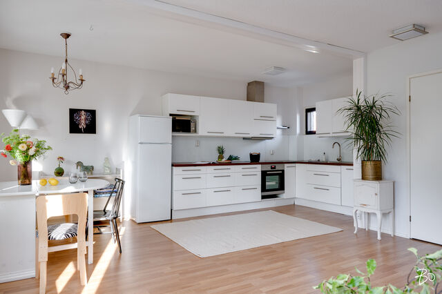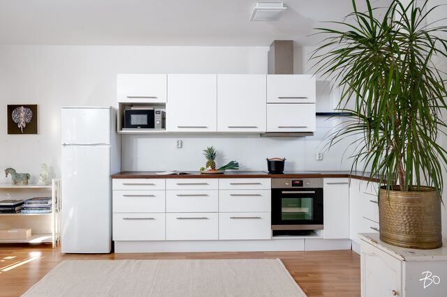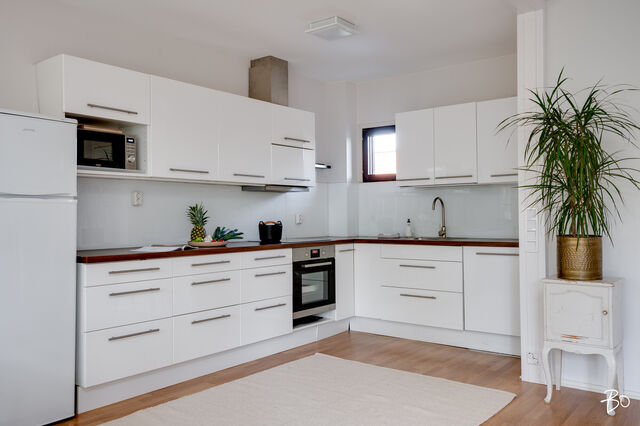 Keittiö on remontoitu tyylikkäästi vuonna 2011 ja varustettu nykyaikaisilla kodinkoneilla. Avokeittiö ja olohuone sulautuvat saumattomasti yhteen muodostaen tilan, jossa arjen kohtaamiset ja juhlat luontevasti syntyvät. Yläkerrasta löytyy myös pieni erillinen wc, joka tuo käytännöllisyyttä arkeen.