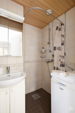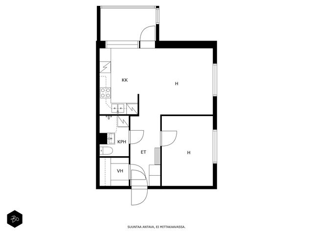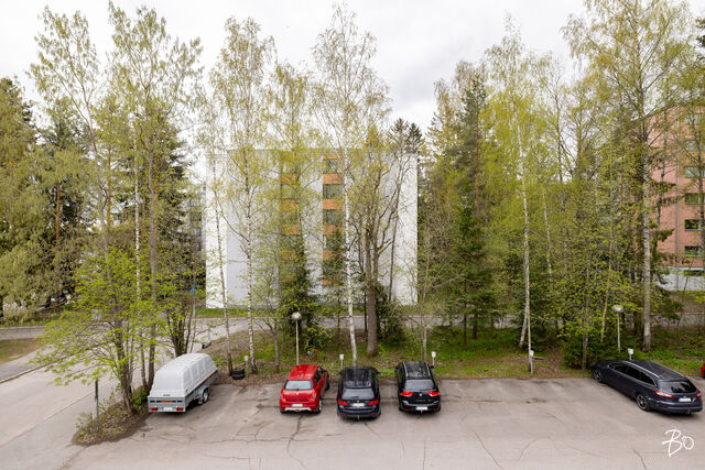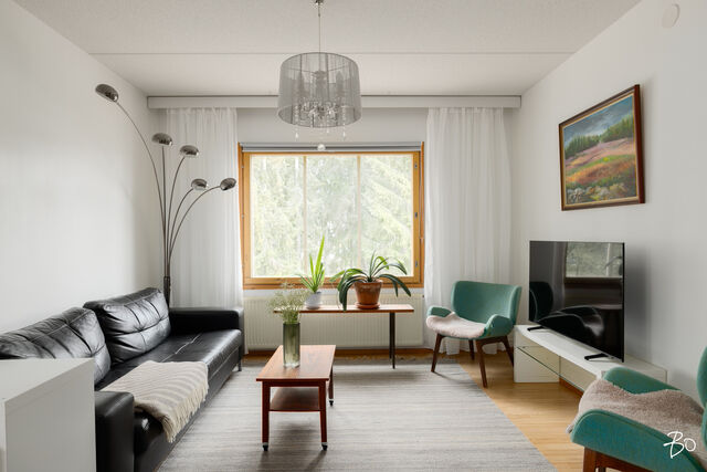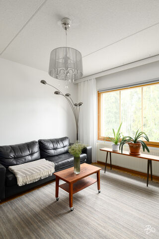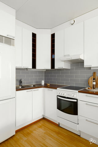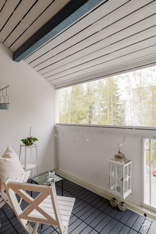 Kolmannen kerroksen kulmahuoneisto hurmaa luonnonvalolla ja avoimella pohjaratkaisullaan. Tilava olohuone yhdistyy saumattomasti valkoiseen keittiöön, jonka tyylikäs ja selkeälinjainen ilme kestää aikaa ja kulutusta. Oleskelutilojen jatkeena on suojaisa lasitettu parveke, joka tarjoaa viihtyisät puitteet kesäpäivistä nauttimiseen.