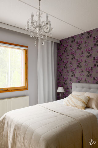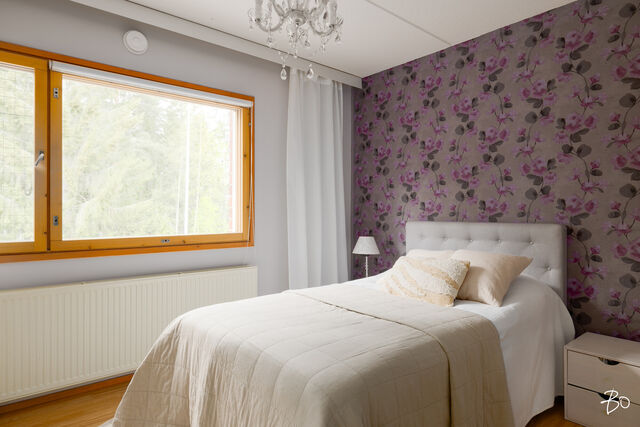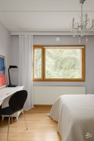 Reilun kokoisessa makuuhuoneessa on mukavasti tilaa myös esimerkiksi etätyöpisteelle tai lukunurkkaukselle. Vaatehuone ratkaisee tämän kodin säilytyspulmat tarjoten runsaasti säilytystilaa eteisen kaapistojen lisäksi.