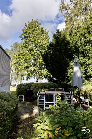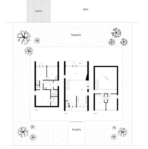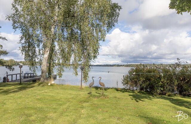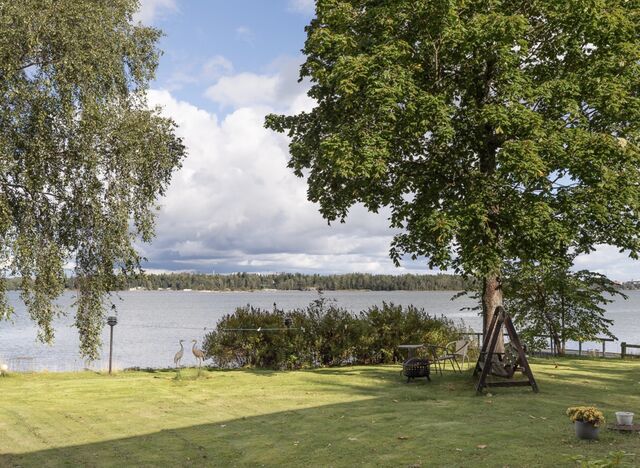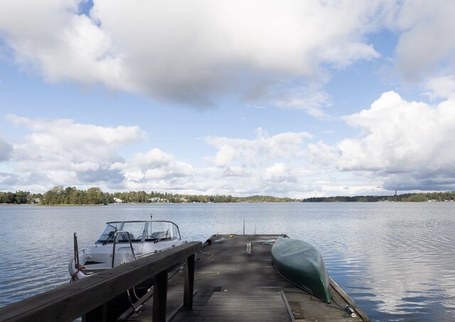 Talolle kuuluu iso piha-alue ja venelaituri, laiturin päässä syväys n. 2m.