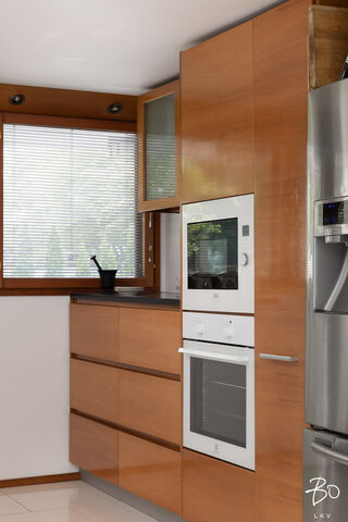 jääkaappi- ja pakastin. Keittiön tasot kiveä, kaapistot tehty käsityönä, Kaya-mahonkia