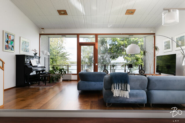 Talon sisääntulokerroksessa olohuone, keittiö ja ruokailutila ovat samaa yhteistä tilaa. Hyvin suunniteltu avokeittiö sekä sisääntulo aula. Tässä kerroksessa on koko seinän leveydeltä isoa ikkunapintaa ja upeat merelliset maisemat Seurasaarenselälle.