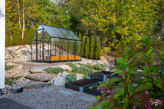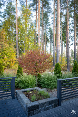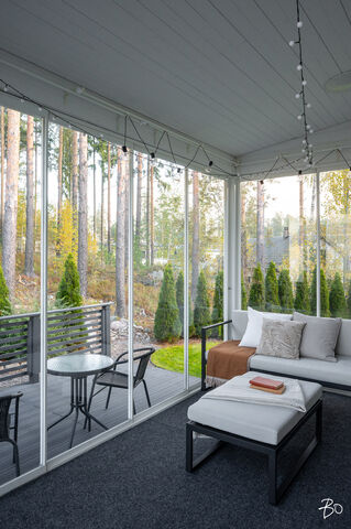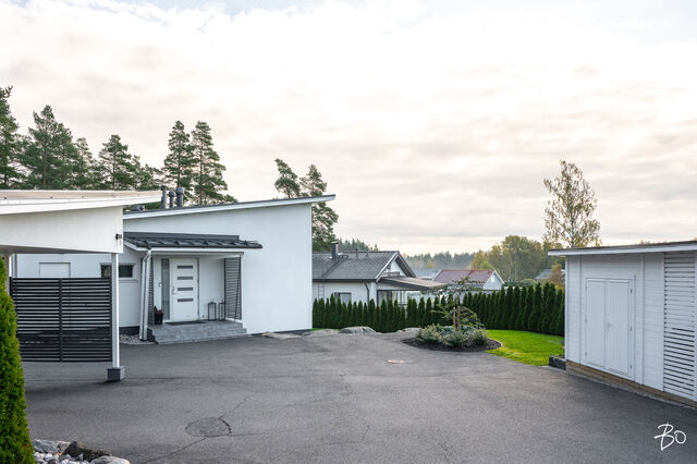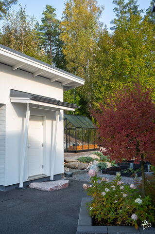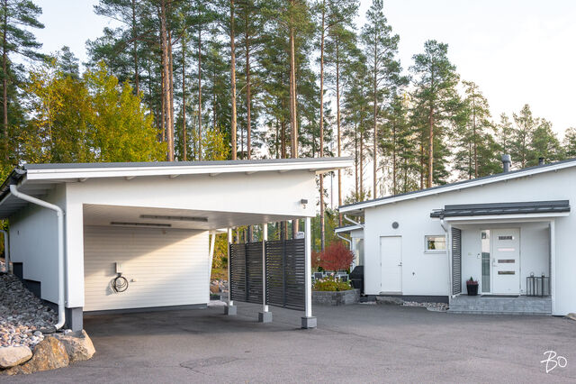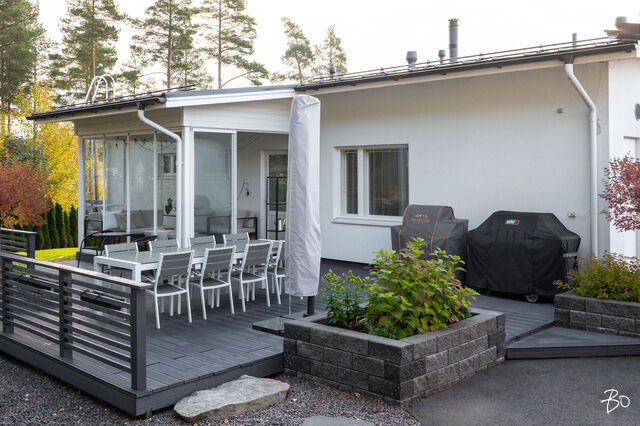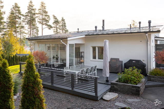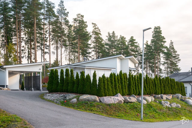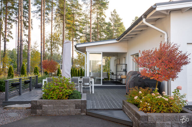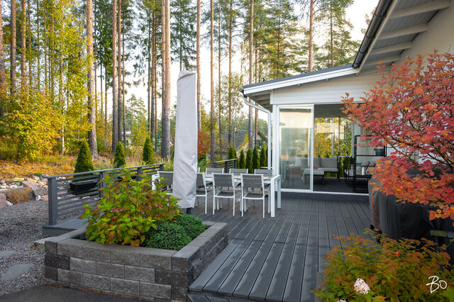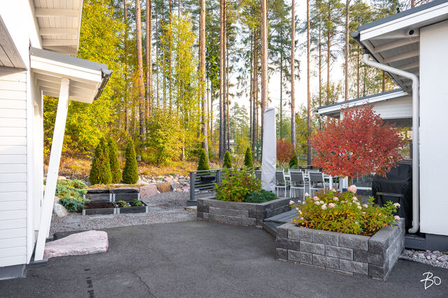 Huolella viimeistelty piha istutuksineen, kasvihuoneineen ja metsään avautuva osittain lasitettu terassi tarjoavat oman rauhan. Koti sijaitsee viihtyisällä ja uudehkolla omakotitaloalueella. Kiinteistö rajoittuu puistoalueeseen ja sillä on vain yksi rajanaapuri. Autokatoksen yhteydessä on lämmin varasto, joka on tällä hetkellä punttisali käytössä.