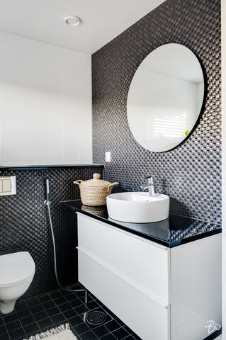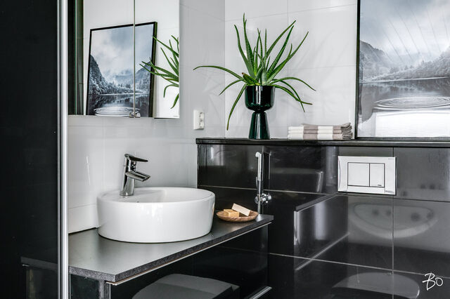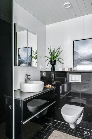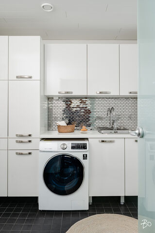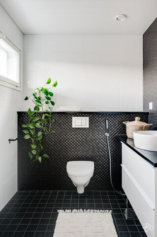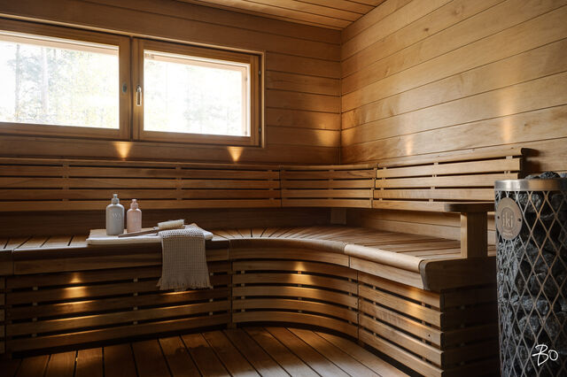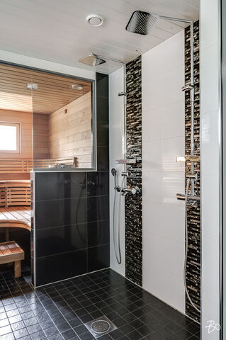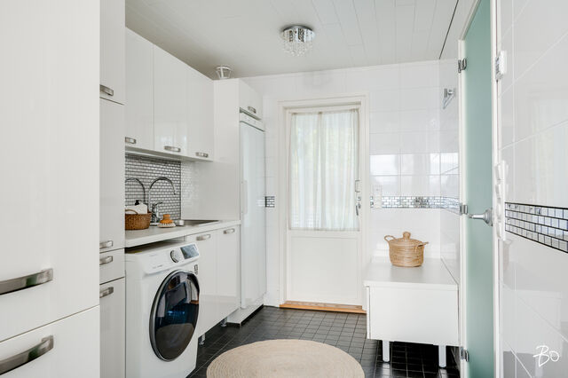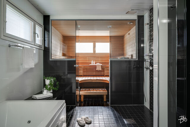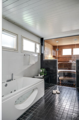 Tilavassa kylpyhuoneessa voit rentoutua poreammeessa tai saunan lämmössä. Talosta löytyy lisäksi myös erillinen wc ja kodinhoitohuone. Uuniseppien varaava takka luo tunnelmaa viileneviin iltoihin ja maalämpö pitää kulutuksen maltillisena.