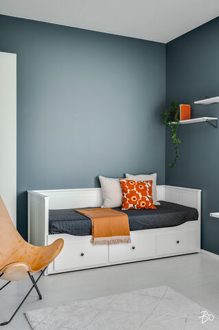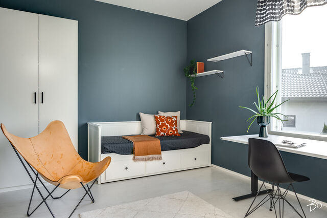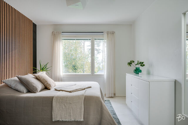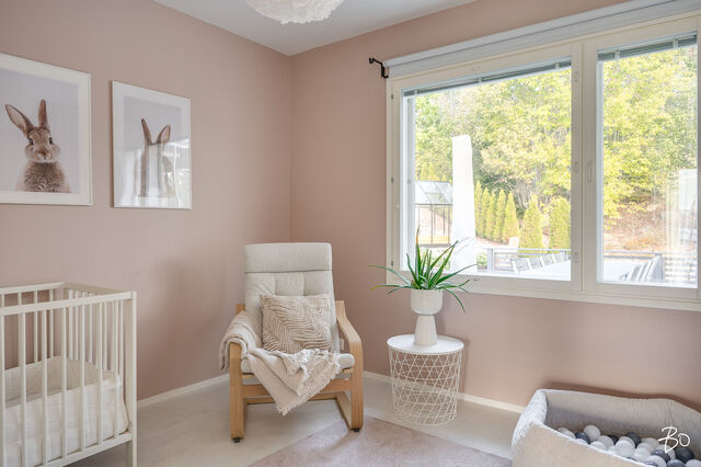 Olohuone ja keittiö muodostavat yhtenäisen kokonaisuuden, joka on kuin tehty yhteisiin hetkiin. Tiloja rytmittävät hienovaraiset tasoerot, jotka luovat kotiin mielenkiintoa ja persoonallisuutta. Hyvin varustellussa Noblessa -keittiössä on laadukkaat kodinkoneet, runsaasti laskutilaa ja kaunis näkymä pihalle. Makuuhuoneita on yhteensä kolme, joista kaksi toimii tällä hetkellä lastenhuoneina ja jotta säilytystila ei lopu kesken löytyy yhden makuuhuoneen yhteydestä on myös vaatehuone. Päämakuuhuonetta koristaa kaunis rimaseinä.