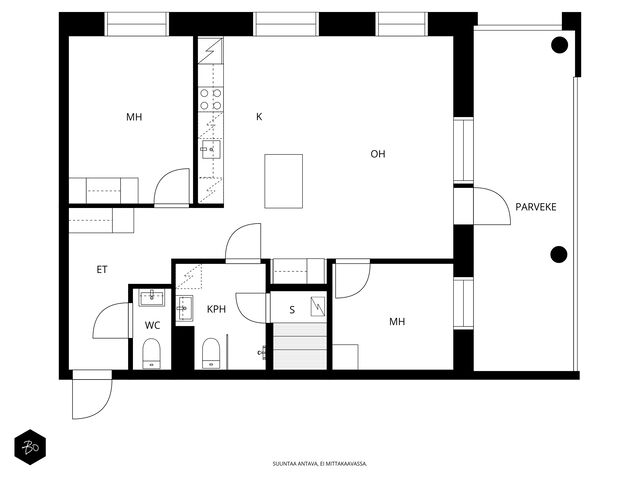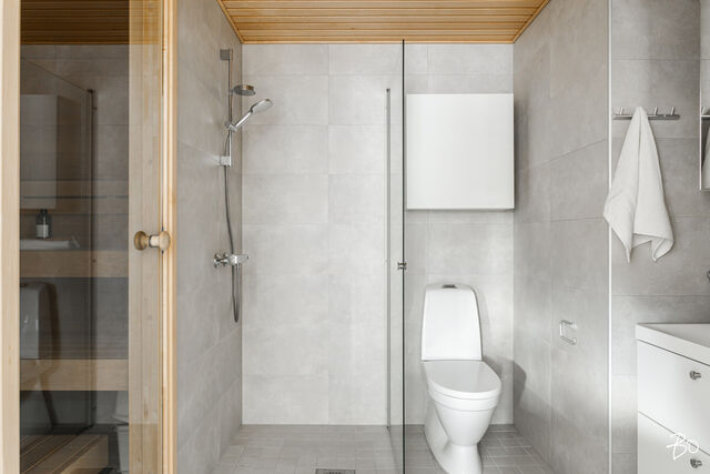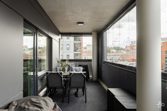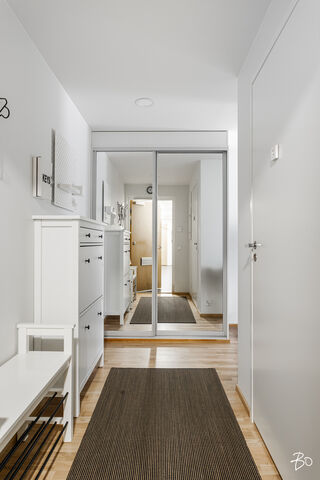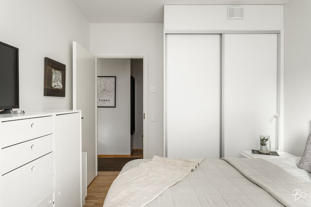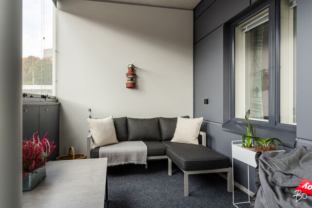 Huoneistossa on kaksi makuuhuonetta, kaunis valkoinen keittiö sekä avara olohuone, josta on kulku koko asunnon pituudelta jatkuvalle lasitetulle parvekkeelle. Parveke tuo kotiin lisätilaa ja toimii täydellisenä paikkana rentoutumiseen vuodenajasta riippumatta. Kylpyhuoneessa on oma sauna, ja erillinen wc tekee arjesta helppoa ja mukavaa.