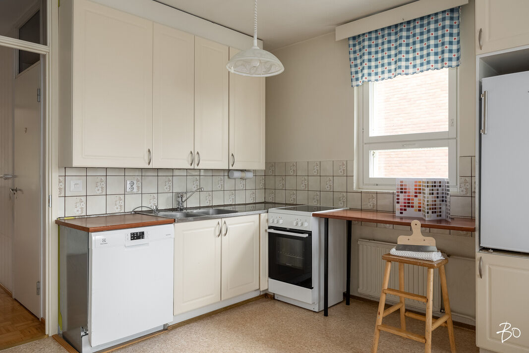 Tämä päätyhuoneisto on läpitalon asunto ensimmäisessä kerroksessa, mutta silti korkealla näköalalla. Huoneisto koostuu valoisasta olohuoneesta, kolmesta makuuhuoneesta, keittiöstä, kylpyhuoneesta, erillisestä WC:stä sekä kahdesta vaatehuoneesta ja parvekkeesta. Kodilla on runsaasti potentiaalia uuden omistajan tarpeisiin.