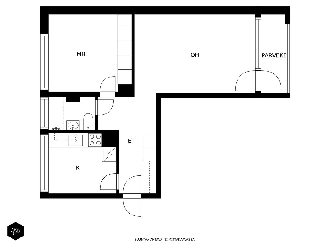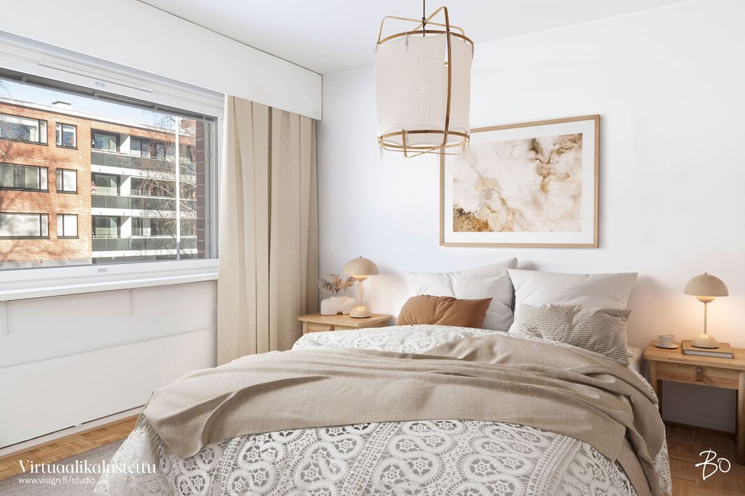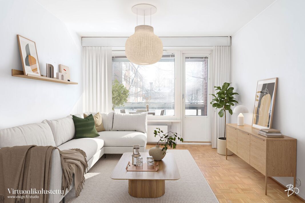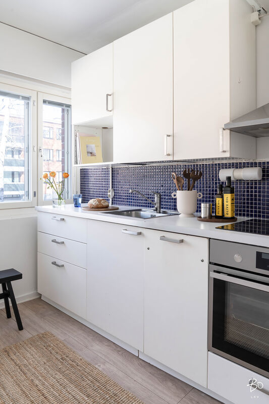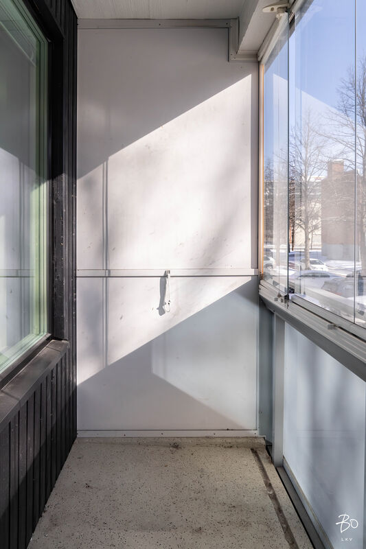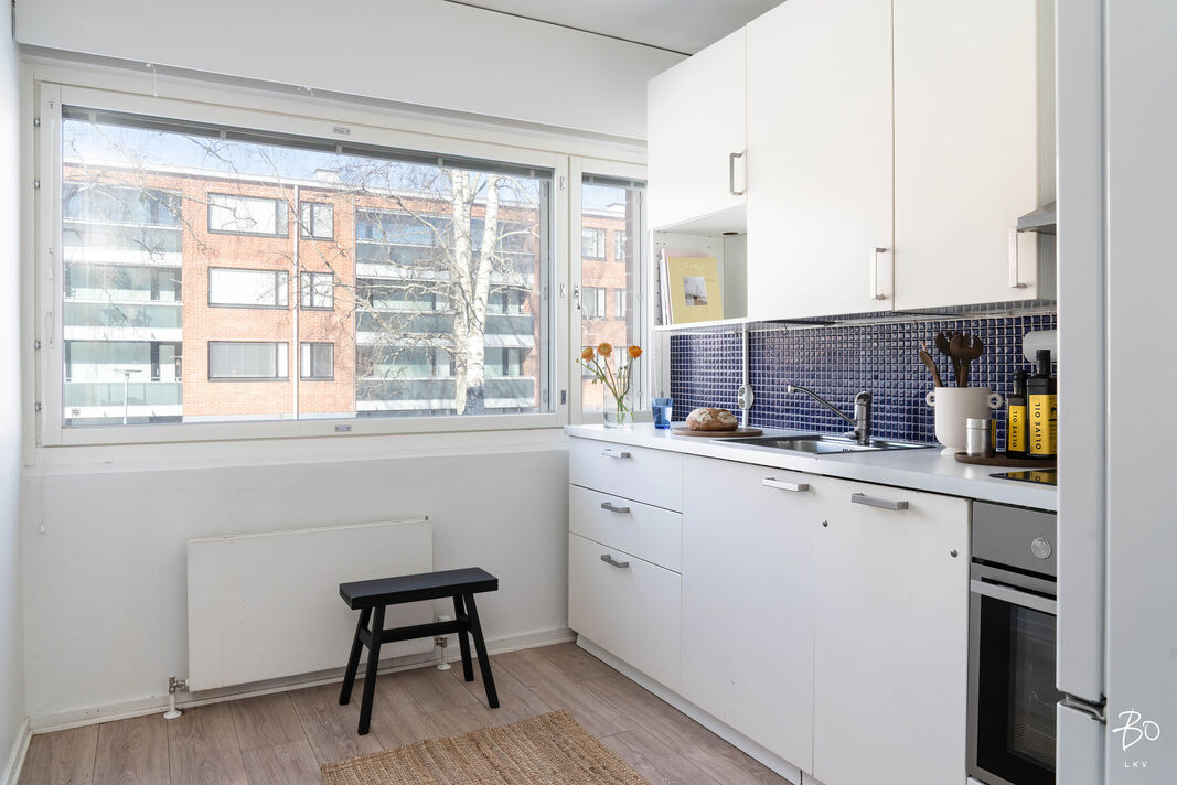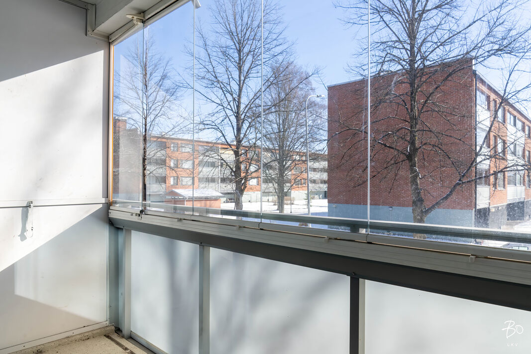 Tilavasta olohuoneesta on käynti lasitetulle parvekkeelle. Kompakti erillinen keittiö, josta löytyy kaikki tarpeellinen. Suurehko makuuhuone sekä eteinen, jotka tarjoavat runsaasti kaivattua säilytystilaa. Mosaiikkiparketti huokuu lämpöä ja kodikkuutta. Asunnon suurista ikkunoista avautuvat viihtyisät kaupunkinäkymät kahteen ilmansuuntaan ja luonnonvaloa riittää aamusta iltaan. Asunto on peruskuntoinen ja pienellä pintojen päivityksellä on mahdollista luoda moderni ja toimiva unelmiesi kaupunkikoti.
