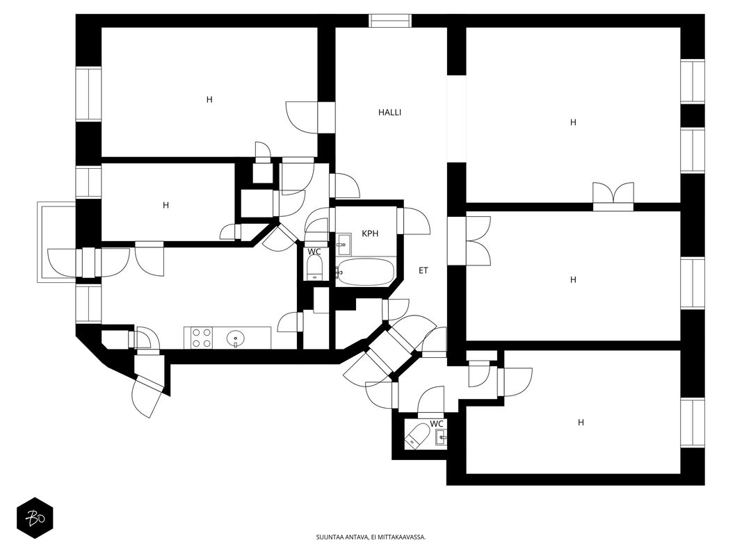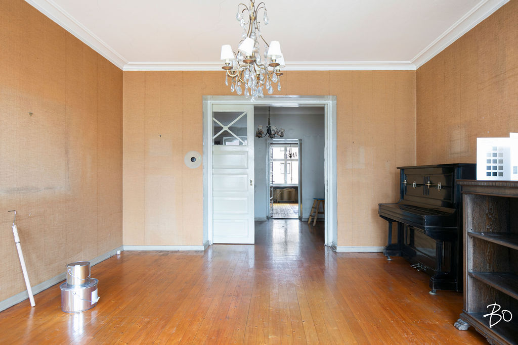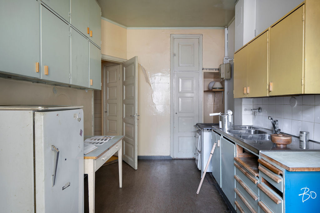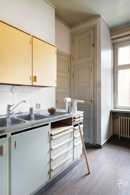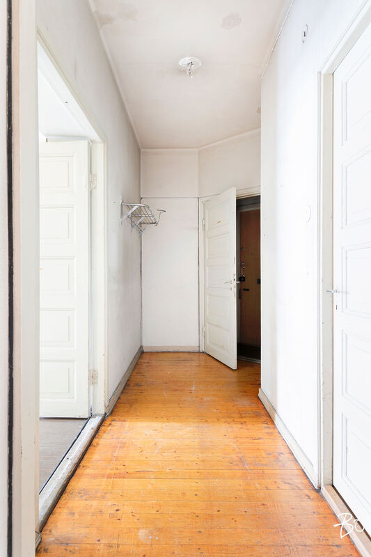 Huoneiden rytmitys on klassinen ja elegantti. Tilava halli yhdistää asunnon huoneet toisiinsa ja antaa mahdollisuuden luoda upean keskipisteen kodin arkeen. Olohuone ja ja yksi makuuhuoneista sijoittuvat kulmaan, jossa valo kulkee huoneesta toiseen, ja korkeat ikkunat kehystävät näkymää kaupungille. Keittiö on säilyttänyt alkuperäistä tunnelmaansa ja tarjoaa tilaa sekä säilytykselle että uudistuksille - remontilla tästä syntyy moderni keittiö, joka säilyttää 1930-luvun arvokkuuden.