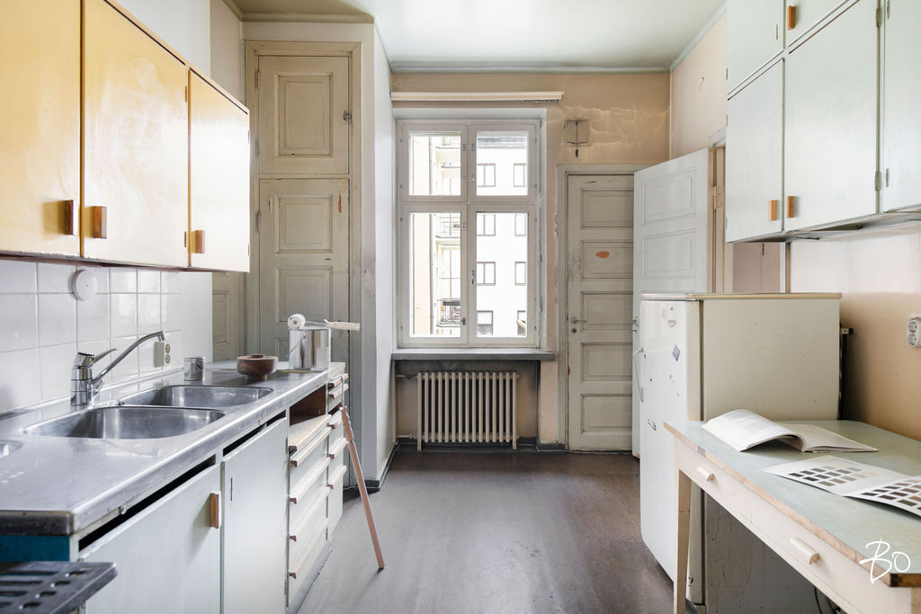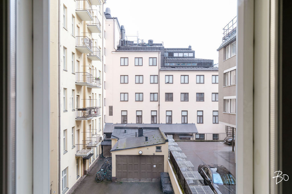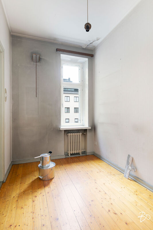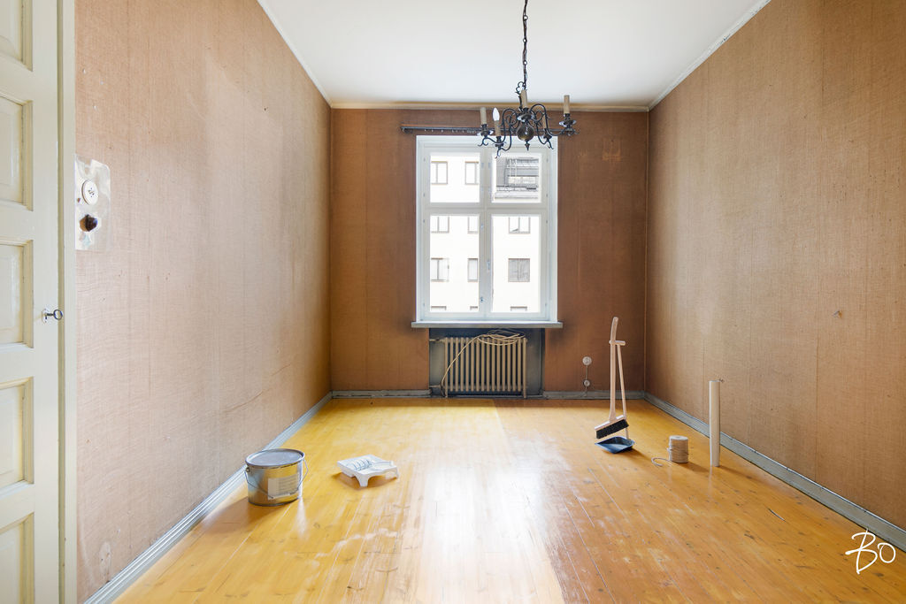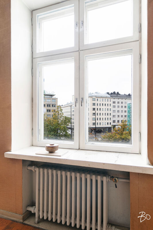 142 neliötä, korkeat huoneet ja suuret ruutuikkunat tekevät tästä asunnosta poikkeuksellisen. Valo siivilöityy sisään kahdelta ilmansuunnalta, ja näkymät kantautuvat sekä Fredrikinkadun vilinään että rauhallisemmalle sisäpihalle. Vanhan talon sielu on läsnä jokaisessa yksityiskohdassa - massiiviset pariovet, kattolistat, lankkulattiat ja leveät ikkunalaudat kertovat ajasta, jolloin kodit rakennettiin kestämään.