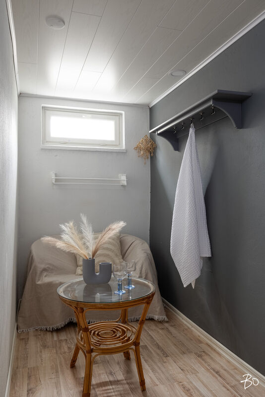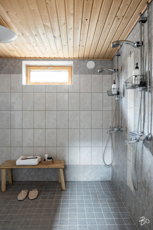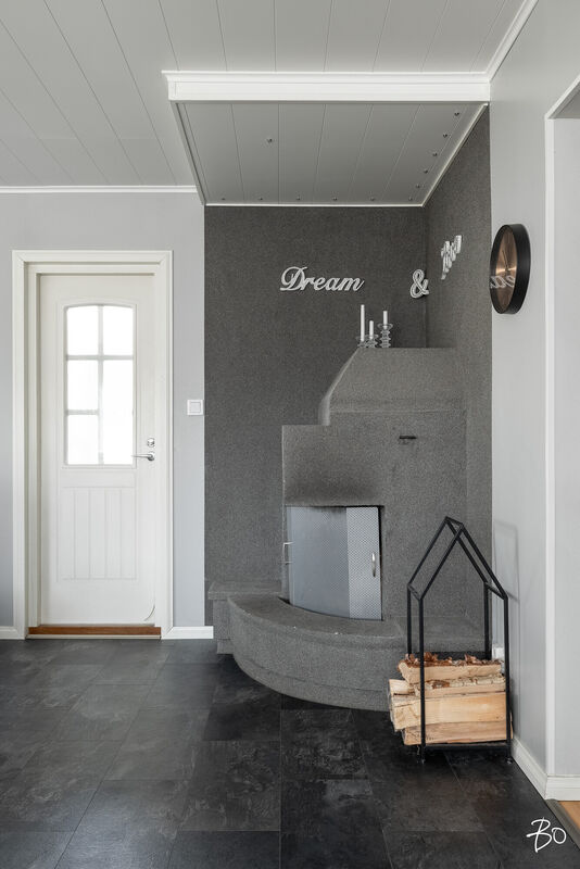 Asuintilat sijoittuvat pääosin talon ylempään kerrokseen, jossa valo tulvii sisään suurista ikkunoista. Kolme makuuhuonetta tarjoavat toimivat puitteet rauhalliselle perhe-elämälle ja tyylikkäässä olohuoneessa on ihana rentoutua varaavan takan lämmössä. Olohuoneesta on myös suoraan kulku verannalle ja terassille, joka jatkaa tilaa kesäisin ulos. Keittiö on lämminhenkinen ja ajattomasti toteutettu: valkoiset kaapistot, puutasot sekä valoisa ruokailutila.