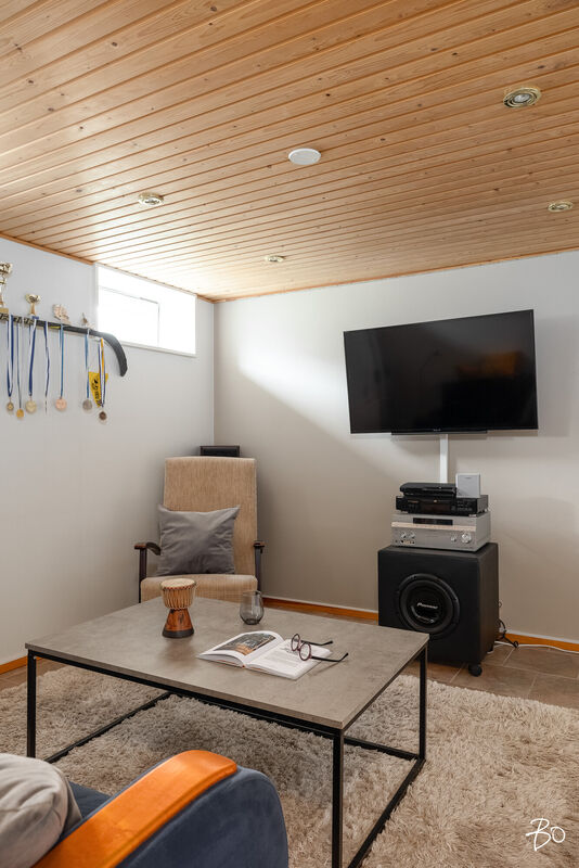 Kellarikerros tarjoaa paljon mahdollisuuksia. Kylpyhuone, sauna puukiukaalla sekä runsaasti harraste-, varasto- ja työtilaa tekevät tästä kodista erittäin käytännöllisen. Alakerran man cave on erityisen tilava ja sinne mahtuu hyvin jopa biljardipöytä. Lämmitysmuotona toimii turvallinen kaukolämpö vesikiertoisin patterein. Lisäksi asumismukavuutta tuovat ilmalämpöpumppu sekä avotakka. Autolle tai muuhun harrastustoimintaan on lämmin talli.