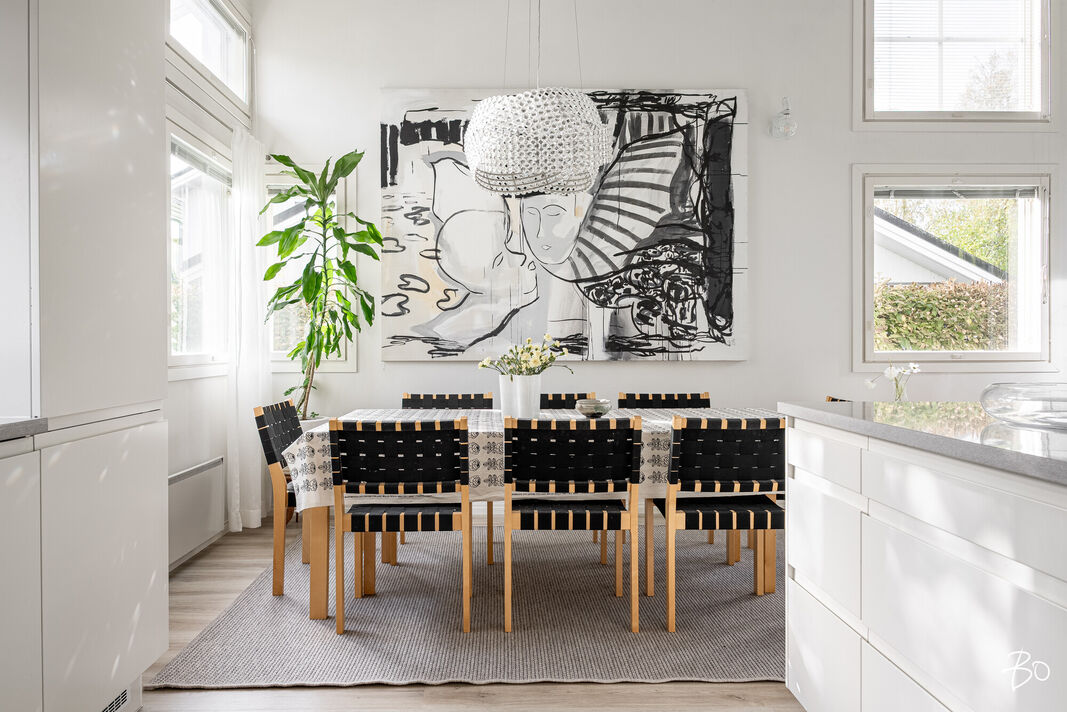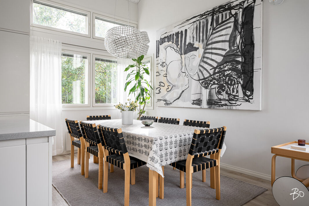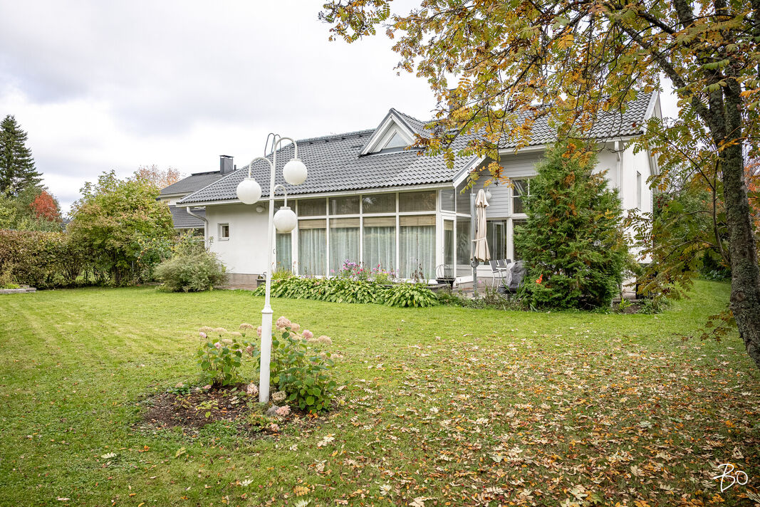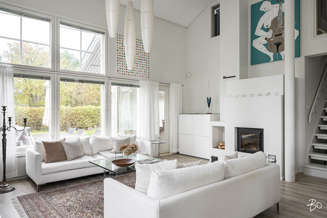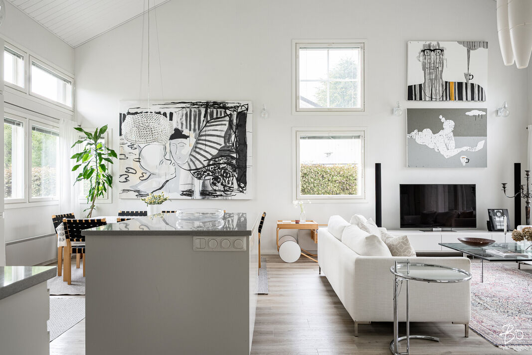 Tässä kodissa on kaikki viimeisen päälle! Keittiössä kivitasot, integroidut kodinkoneet ja hyvin lasku- ja kaappitilaa. Välitila on toteutettu venetsialaisella stucco-pinnoitteella, jota on käytetty myös eteisen ja alakerran wc:n lattioissa ja seinissä sekä olohuoneen, ala-aulan ja työhuoneen seinissä. Tähän arkkitehdin piirtämässä uniikkiin taloon suorastaan tulvii valoa sen suurista ikkunoista.