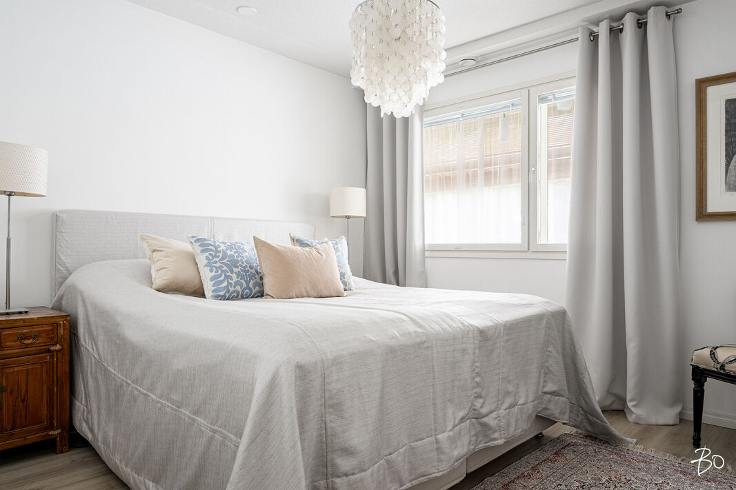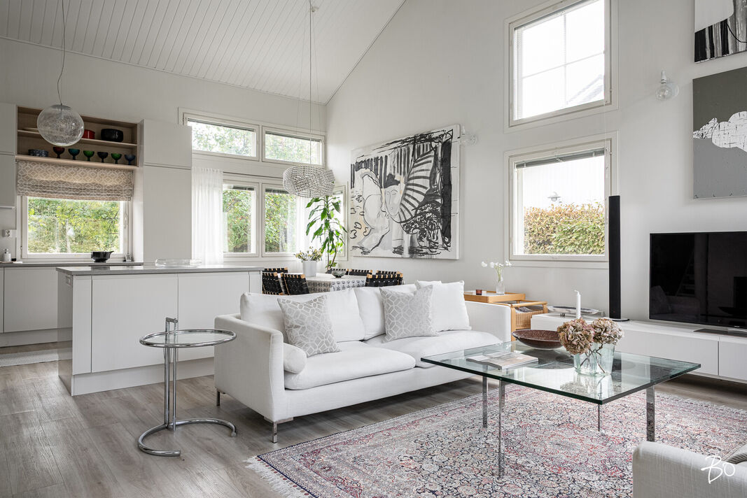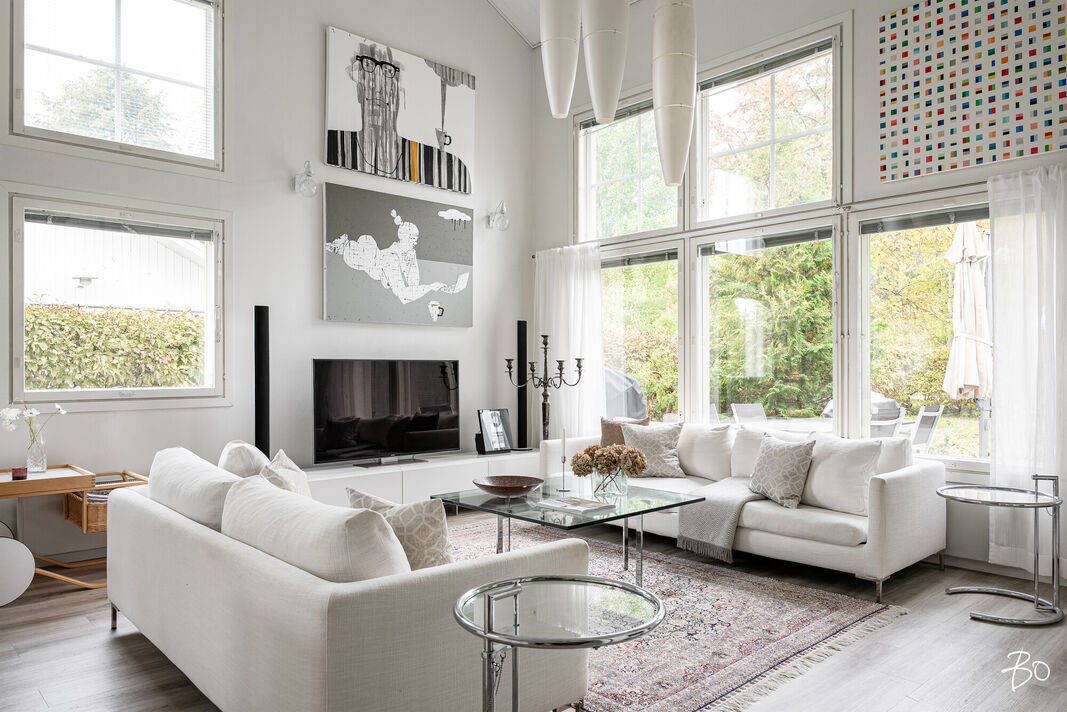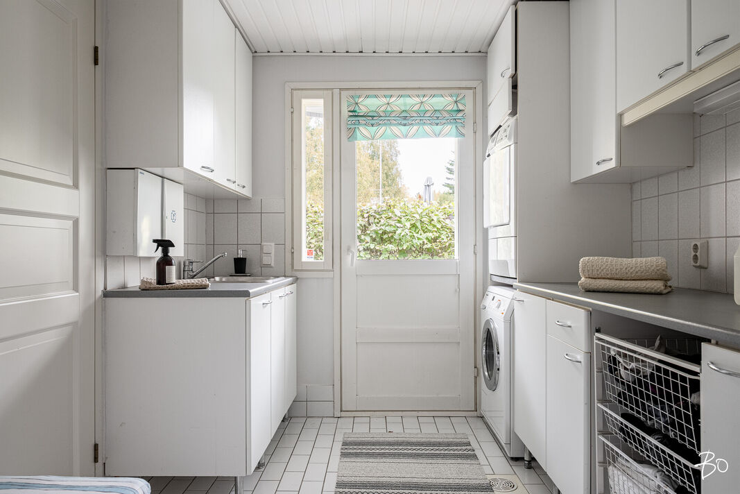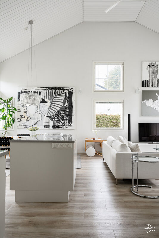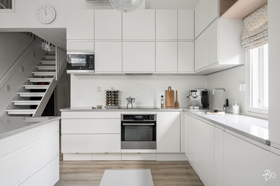 Tässä kodissa on kaikki viimeisen päälle! Keittiössä kivitasot, integroidut kodinkoneet ja hyvin lasku- ja kaappitilaa. Välitila on toteutettu venetsialaisella stucco-pinnoitteella, jota on käytetty myös eteisen ja alakerran wc:n lattioissa ja seinissä sekä olohuoneen, ala-aulan ja työhuoneen seinissä. Tähän arkkitehdin piirtämässä uniikkiin taloon suorastaan tulvii valoa sen suurista ikkunoista.