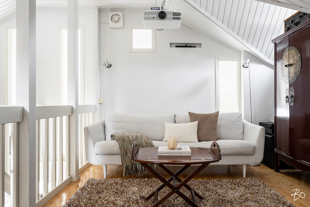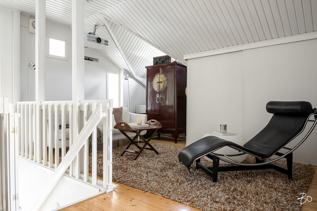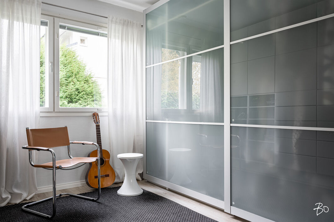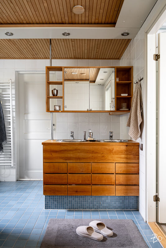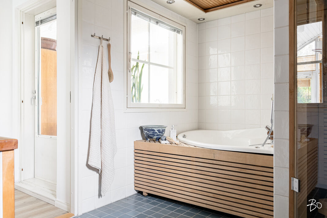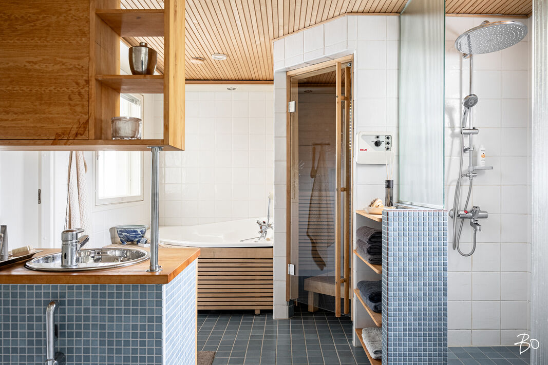 Kylpyhuoneesta löytyvät tuplasuihkut, kylpyamme ja sauna, jonka kiukaassa myös höyrytoiminto. Kylpyhuoneesta kulku lasitetulle terassille, jossa vilvoittelet löylyjen jälkeen vuodenajasta riippumatta, sillä tila lämpeää lattialämmityksellä.