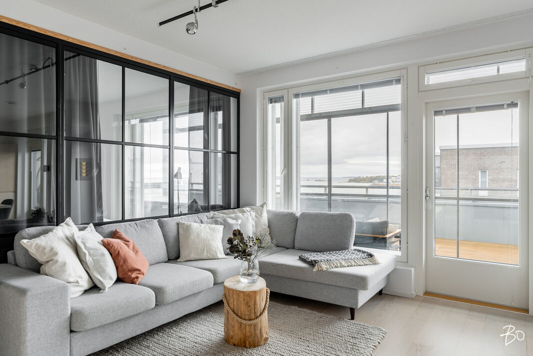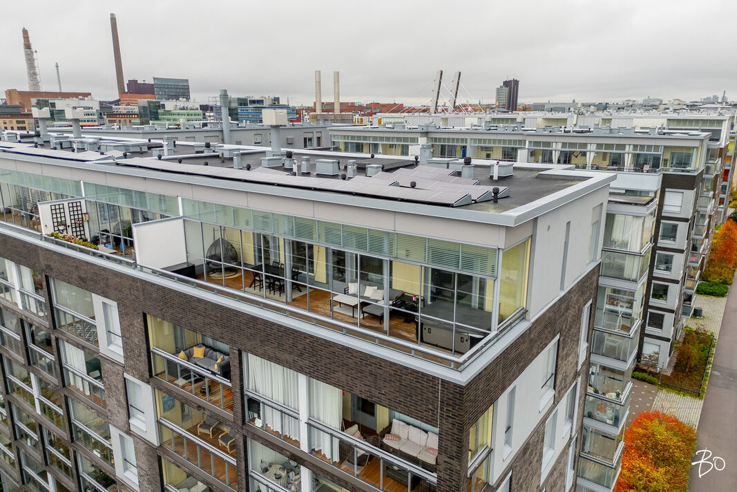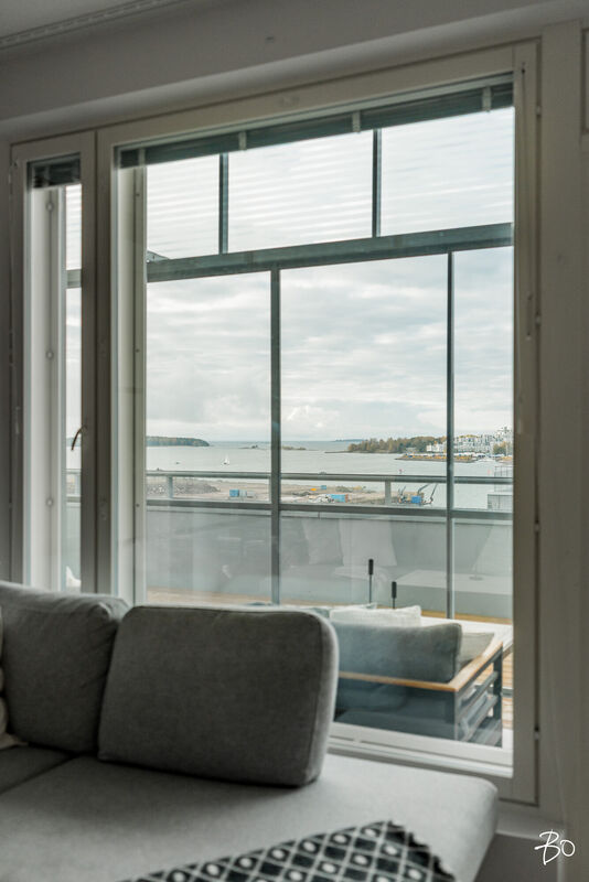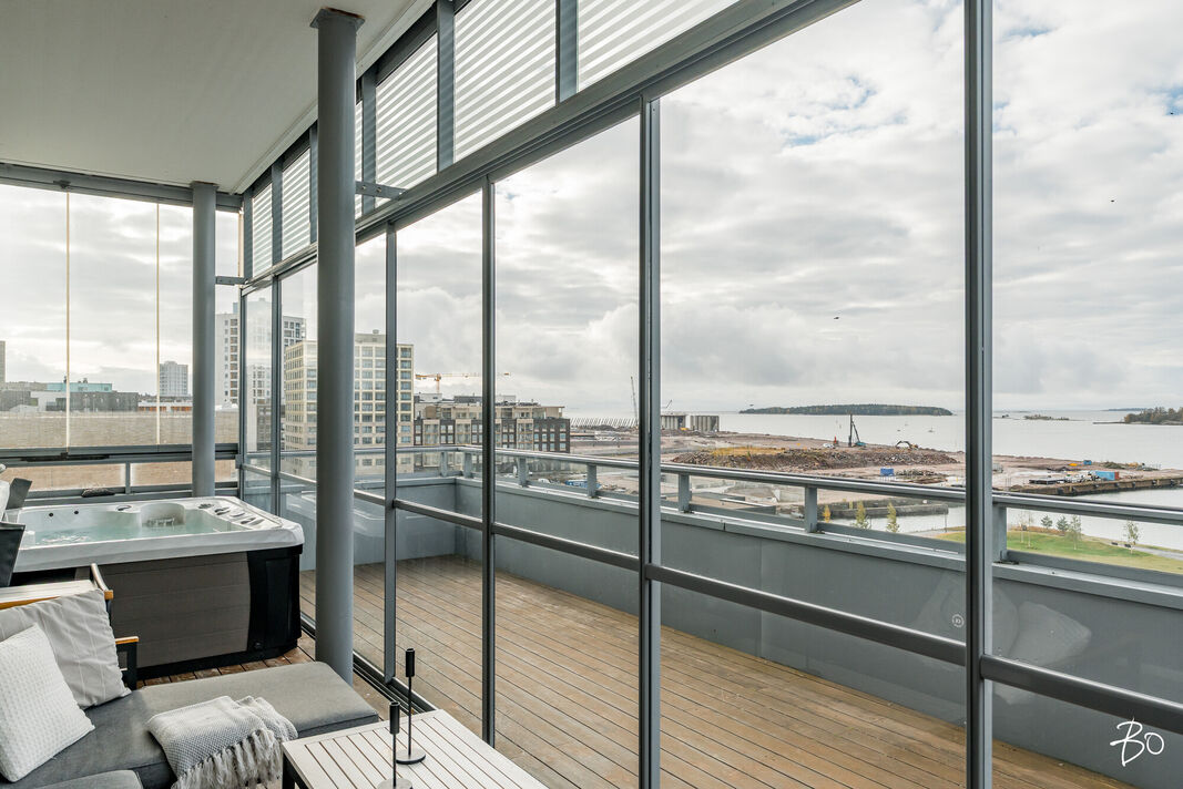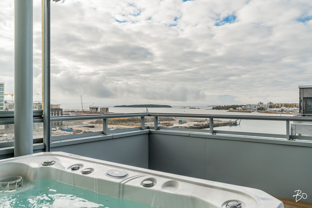 Valoisa avokeittiö ja olohuone muodostavat avaran, yhtenäisen kokonaisuuden, josta avautuu käynti suurelle, osin lasitetulle terassille. Terassilla voit nauttia poreammeen lämmöstä ja huikeista merinäkymistä - täydelliset puitteet rentoutumiseen ja viihtymiseen. Asunnon sijainti ylimmässä, 7. kerroksessa takaa yksityisyyden ja esteettömät näkymät.