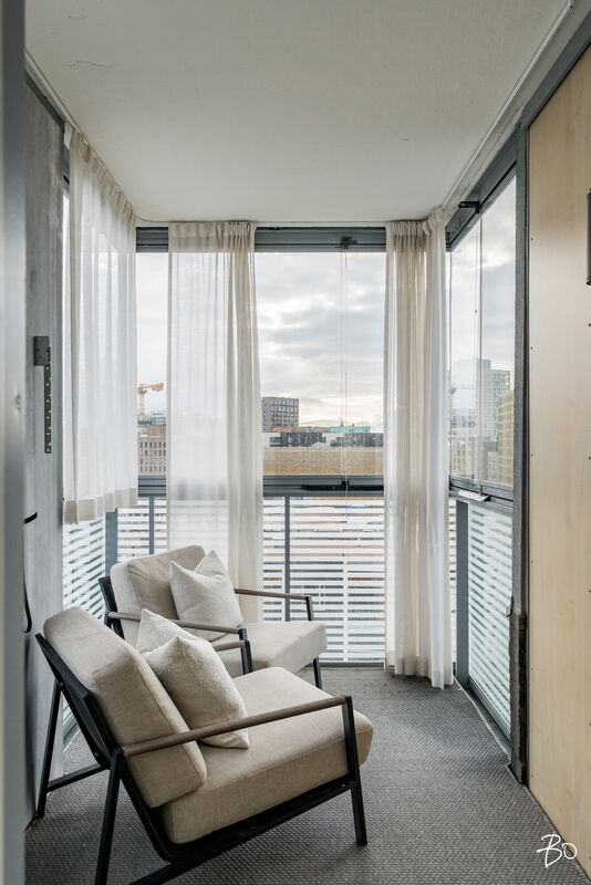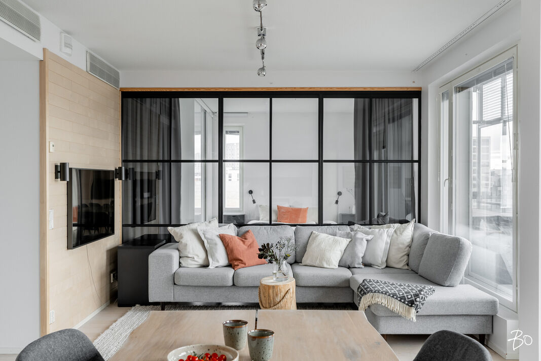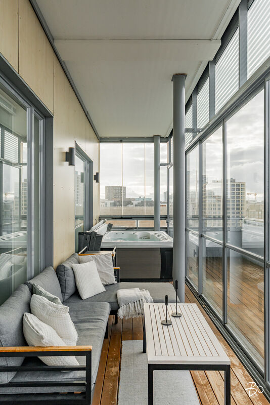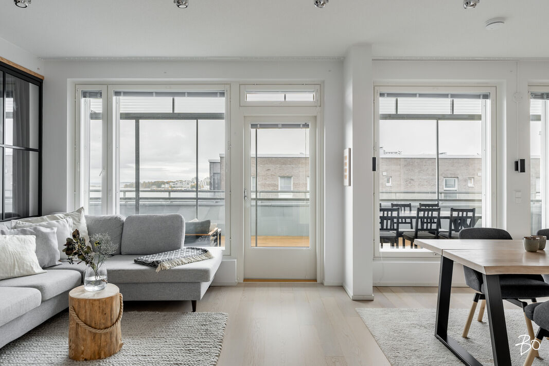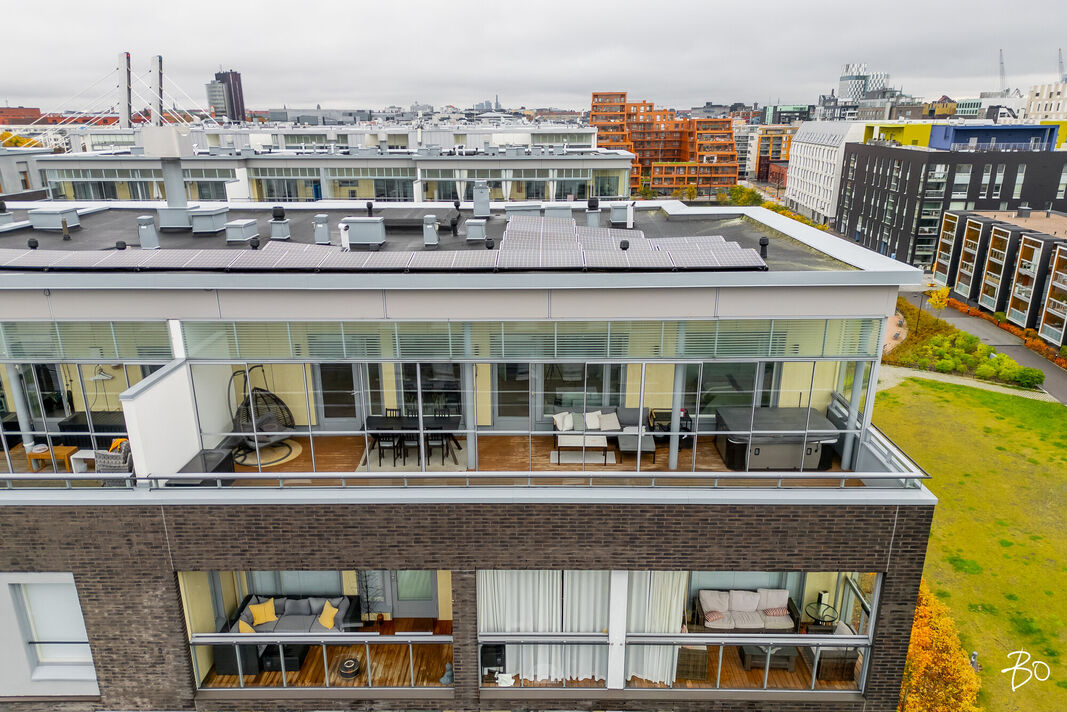 Valoisa avokeittiö ja olohuone muodostavat avaran, yhtenäisen kokonaisuuden, josta avautuu käynti suurelle, osin lasitetulle terassille. Terassilla voit nauttia poreammeen lämmöstä ja huikeista merinäkymistä - täydelliset puitteet rentoutumiseen ja viihtymiseen. Asunnon sijainti ylimmässä, 7. kerroksessa takaa yksityisyyden ja esteettömät näkymät.