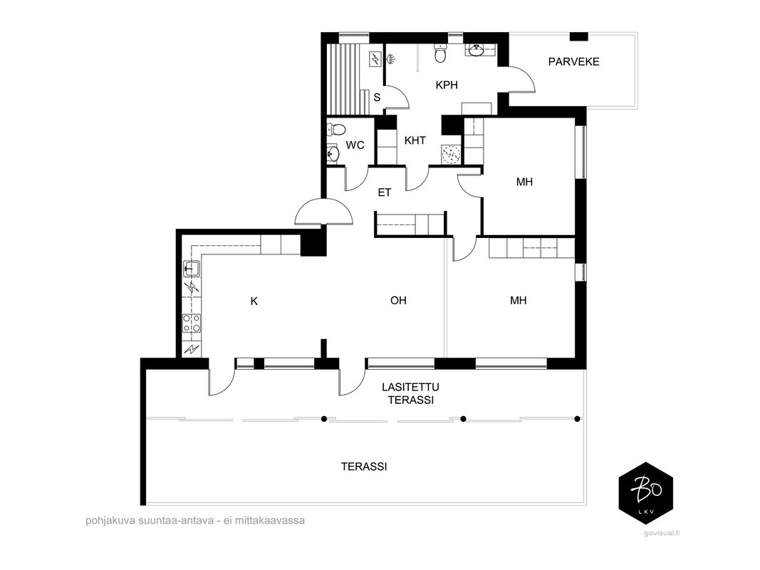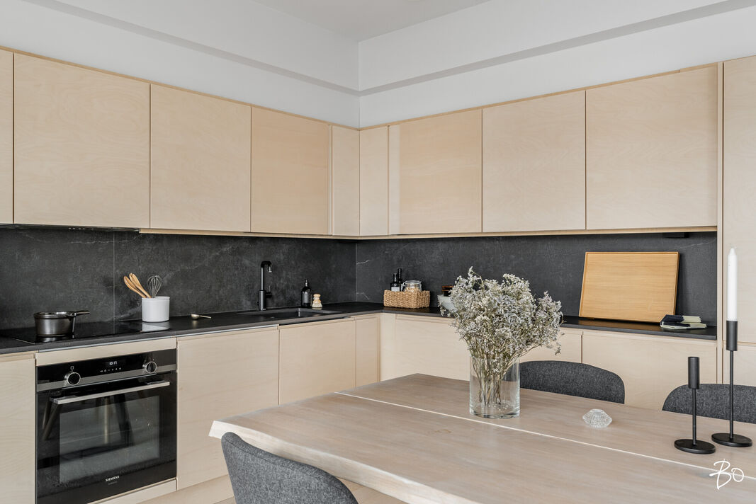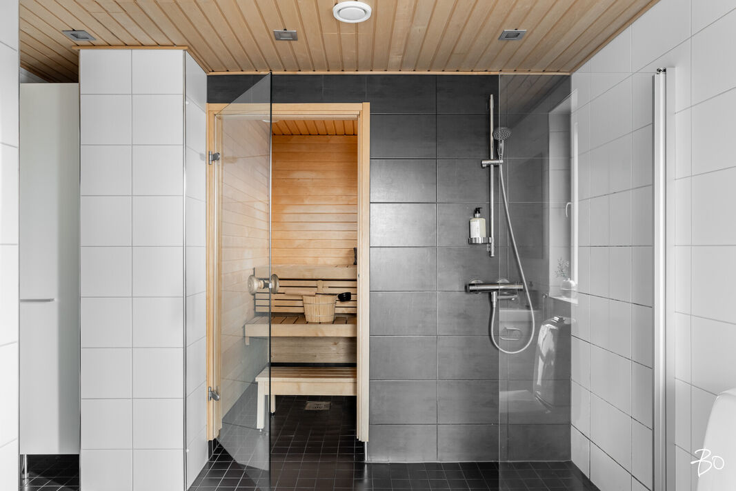 Keittiö on remontoitu vuonna 2021, ja se on toteutettu laadukkailla materiaaleilla ja hyvällä maulla. Kaksi makuuhuonetta tarjoavat käytännöllistä mukavuutta, ja molemmissa on säilytystilaa. Saunaosastolta on suora käynti lasitetulle etelälänsisuuntaiselle parvekkeelle, jossa voit nauttia auringosta aamusta iltaan.
