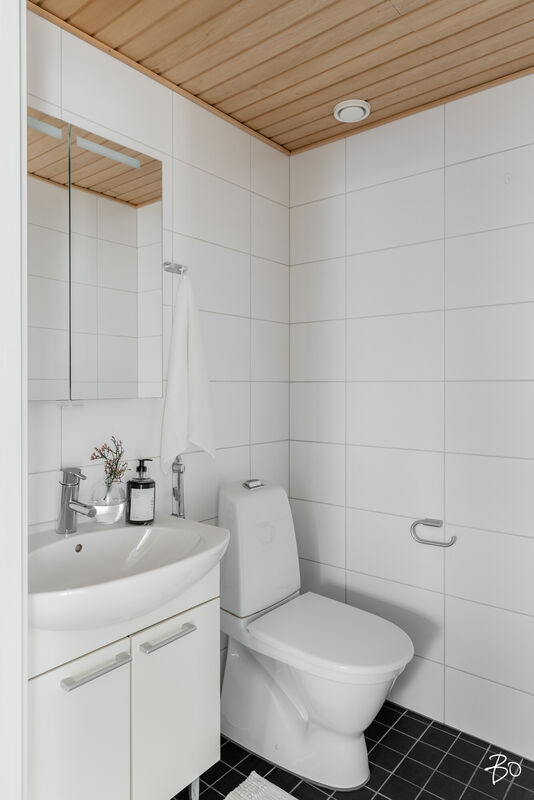 Varustus:suihku, suihkuseinä, allas/allaskaappi, peilikaappi, wc-istuin, pesukoneliitäntä, tila pesutornille, pyyhekuivain, pyykkikaappi, laatoitettu, lattialämmitys.