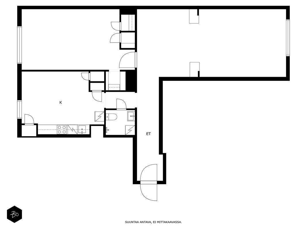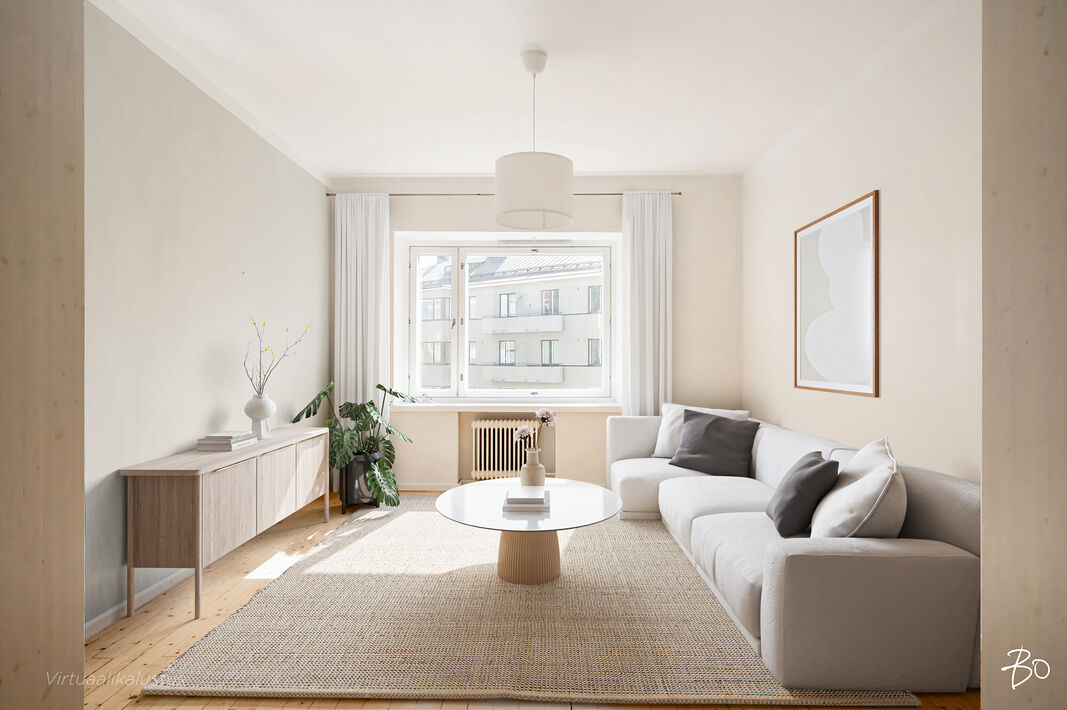 Pidä huoneisto näin kun se on - tai muokkaa makusi ja perheesi tarpeiden mukaan. Kahdelle tämä on ihanan väljä ja ilmava koti ja kolmellekin sen saa hyvin toimimaan.