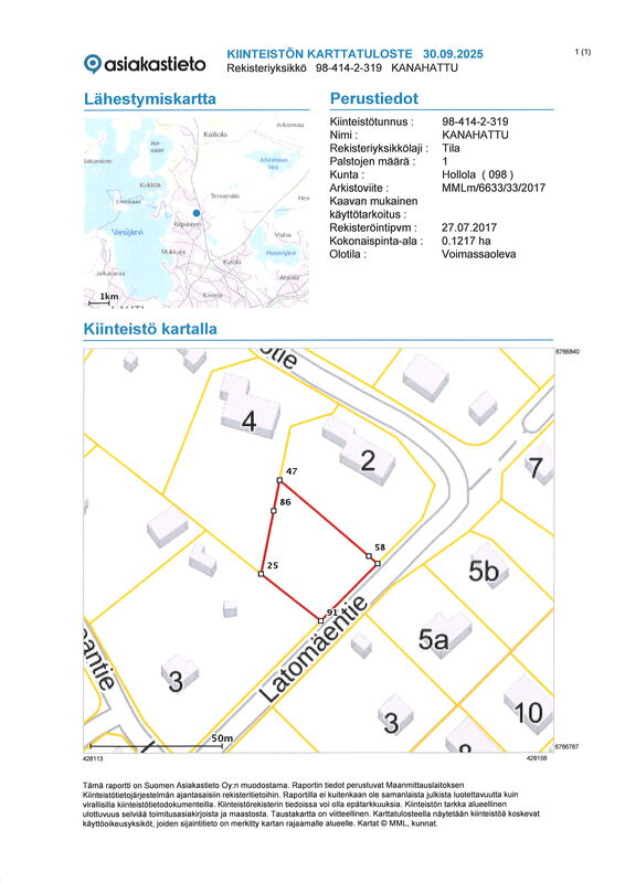 Ympärillä oleva alue on viihtyisää omakotitaloaluetta, joka on rakentunut eri vuosikymmenien aikana. Rakennusoikeutta tilalla on 243,4 m2. Ko. tilalle saa rakentaa 1 1/2 kerroksisen omakotitalon, jossa ylempi kerros on asuintilaa ja alakerrasta max. puolet saa olla asuintilaa ja puolet esim. autotallia.